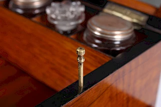 État restauré. La serrure et le tiroir fonctionnent parfaitement. Le bois est poli à la gomme-laque. Il y a des frottements plus importants sur certains des couvercles argentés.