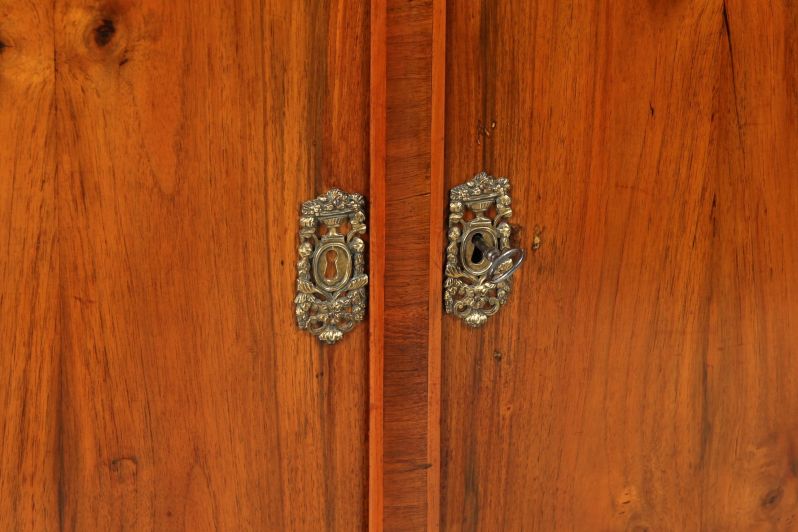 Nous voyons des veines de noyer continues sur la façade et les côtés. Typiques de l'époque et de la région, les pilastres et la baguette de frappe sont légèrement arrondis et plaqués transversalement. Les plaques de clé en laiton présentent des corbeilles de fruits bien remplies, des suspensions de fleurs, de feuilles et de glands.