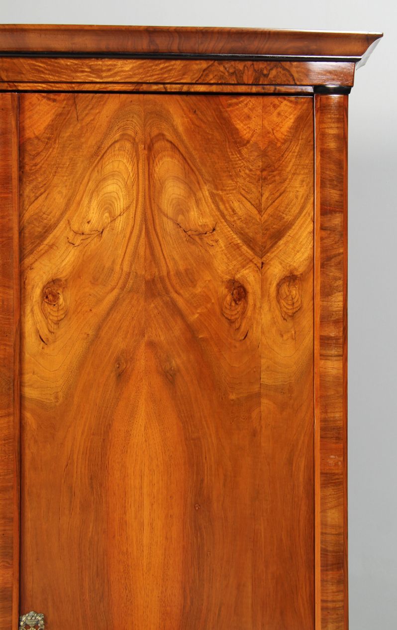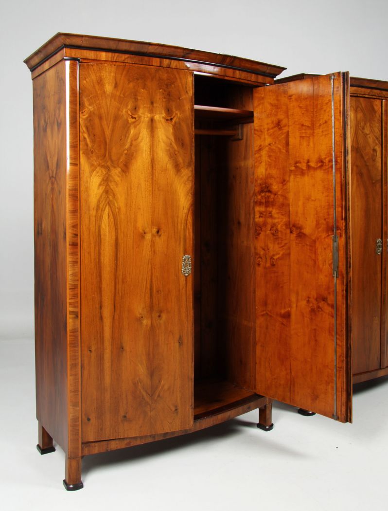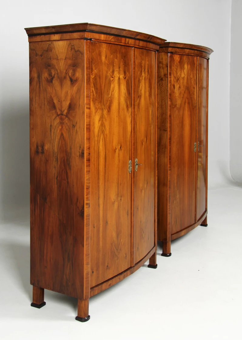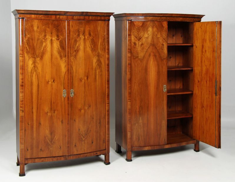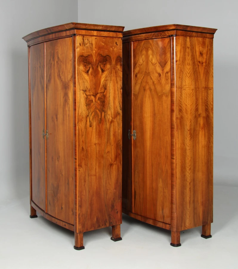 Les veines des deux armoires proposées ici ne correspondent certes pas exactement, mais sont néanmoins très harmonieuses. Il est possible que les armoires n'aient pas été fabriquées en même temps, mais à quelques années d'intervalle. L'achat d'un meuble était à l'époque une affaire coûteuse, car le matériau était cher et la fabrication, en particulier avec les façades incurvées, prenait beaucoup de temps.