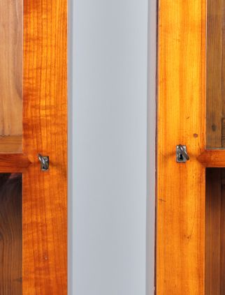 La tablette centrale des trois étagères à l'intérieur est fixée et assure, en tant qu'élément constructif, la stabilité nécessaire dans le meuble. La hauteur des deux autres étagères est variable grâce à une crémaillère. Le réglage en hauteur visible sur les photos est judicieux dans la mesure où les étagères se trouvent ainsi exactement derrière les barreaux. Les bords avant des étagères, également plaqués en cerisier, constituent un joli détail.