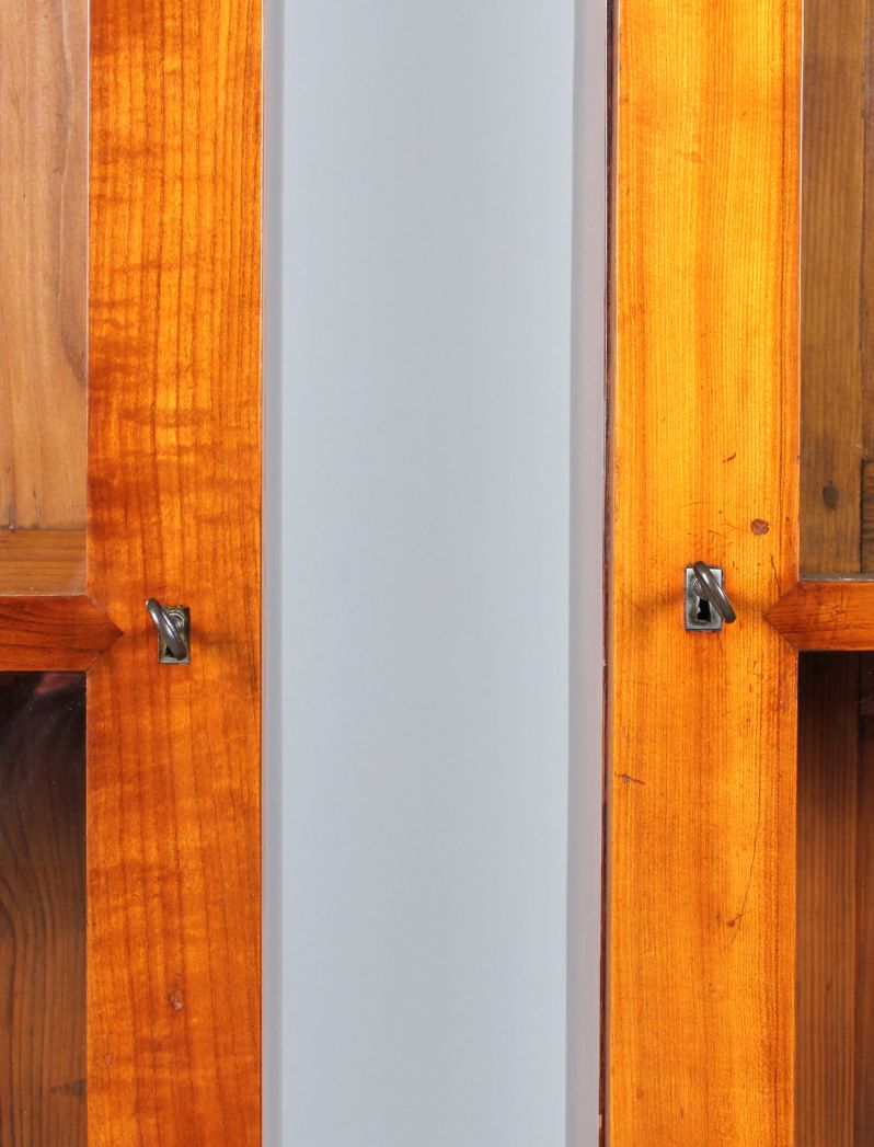 Ces meubles au design strictement cubiste reposent sur des pieds pointus et ont chacun une grande porte à croisillons avec huit panneaux vitrés. Les vitres sont anciennes et en grande partie d'origine, la vidéo ci-jointe permet de bien voir la surface de verre en mouvement et irrégulière.
