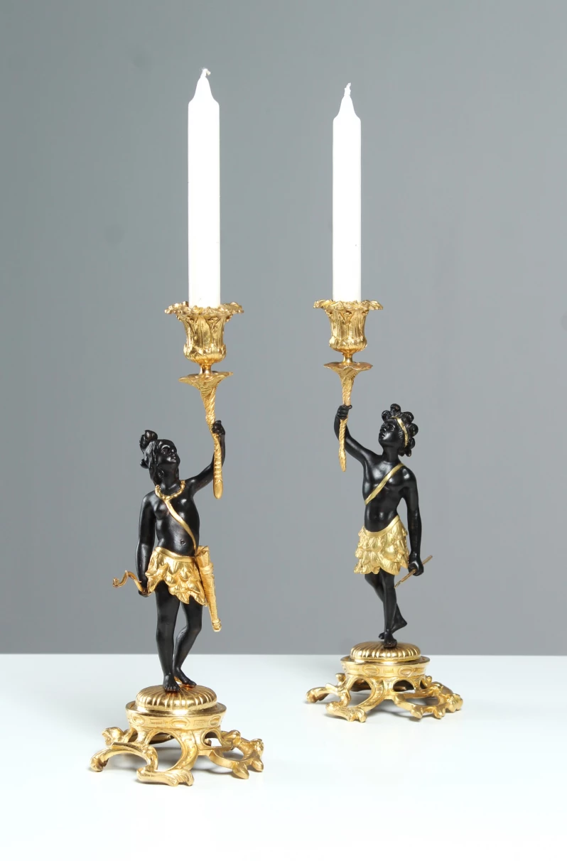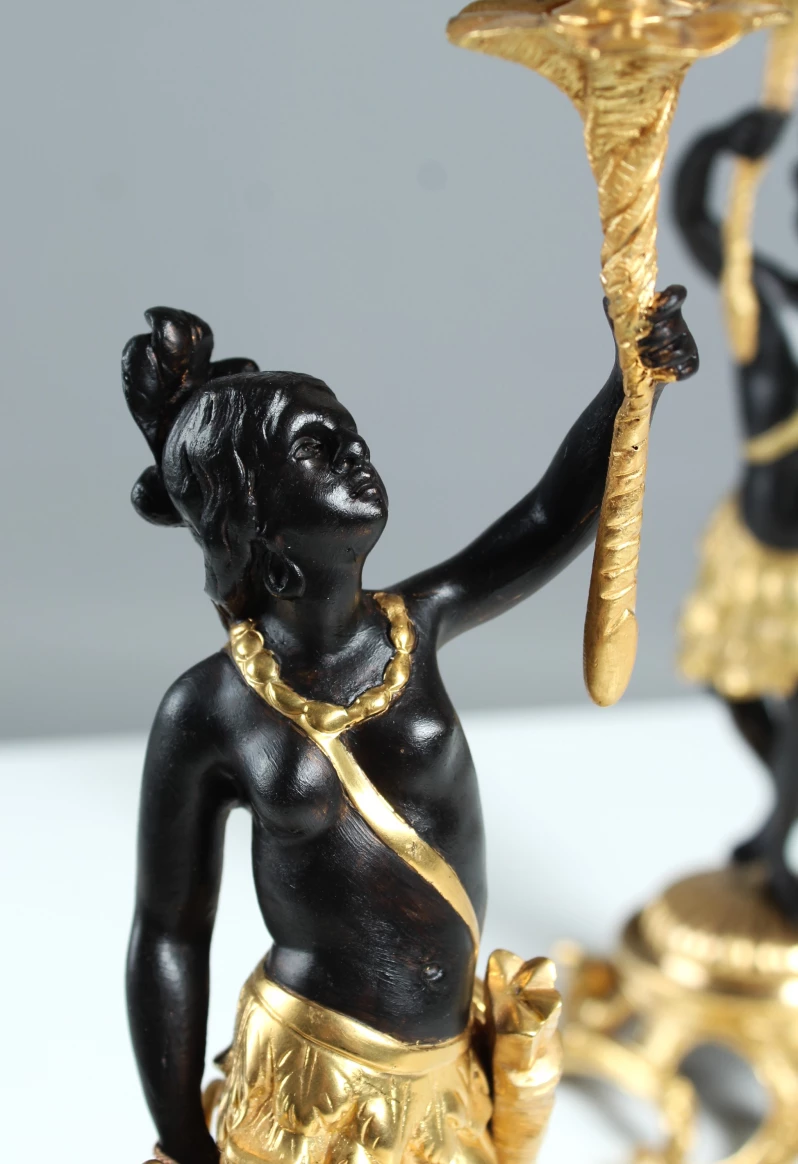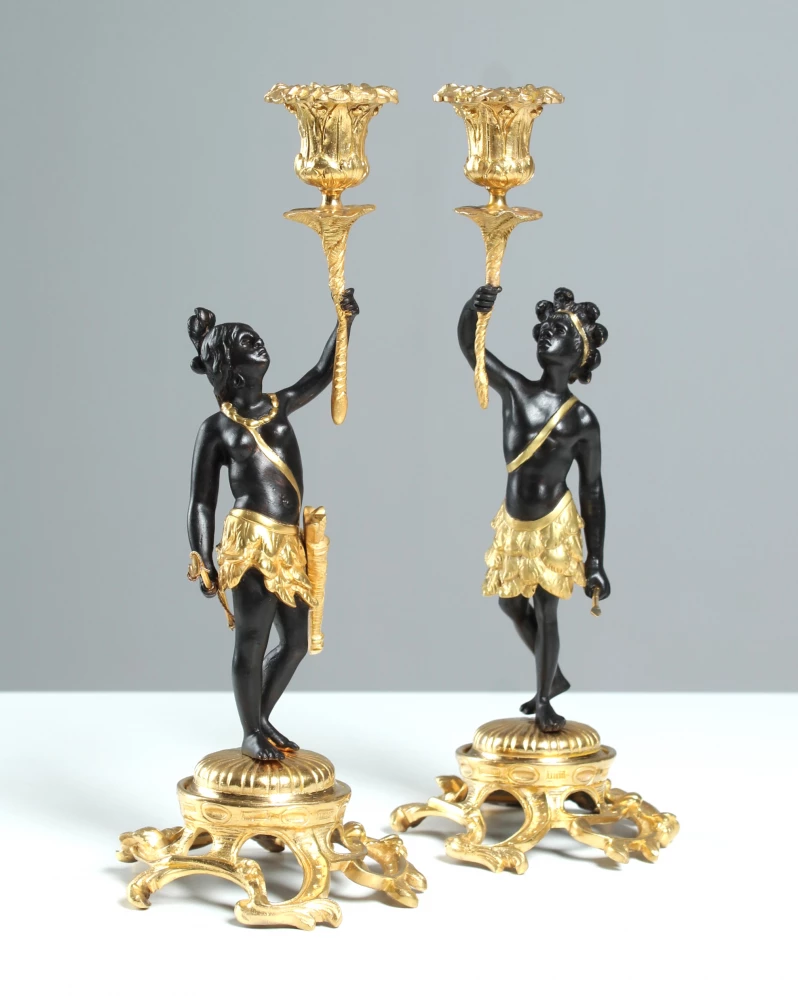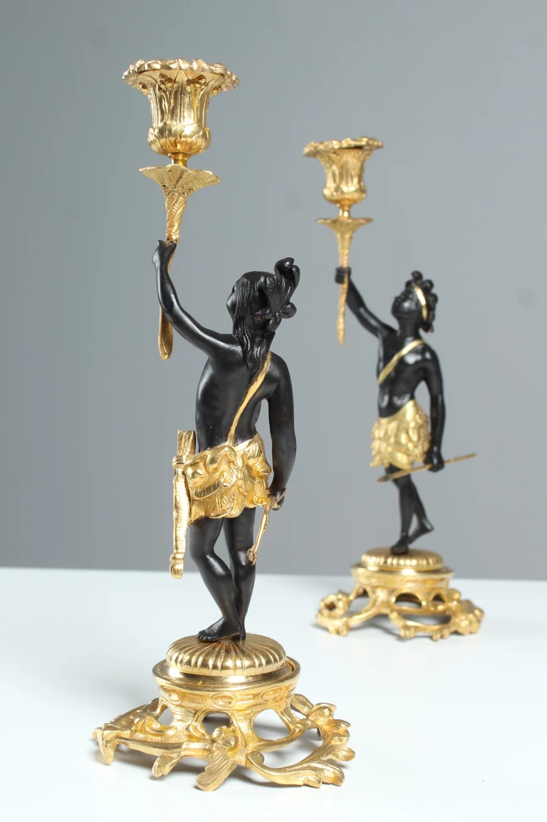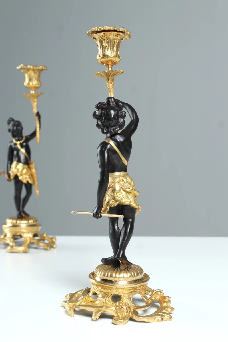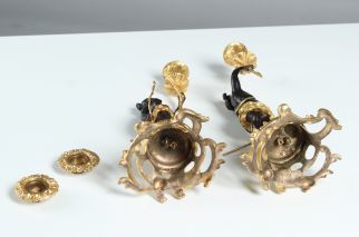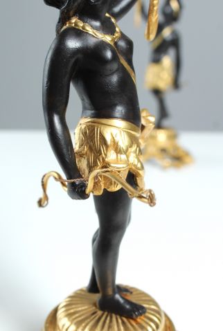 Paire d'élégants chandeliers figuratifs en bronze doré et patiné.