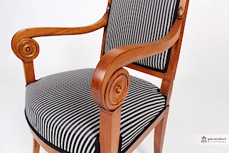 Pieds pointus légèrement évasés, se terminant en cône. Ceux de devant servent de support aux accoudoirs artistiquement galbés.