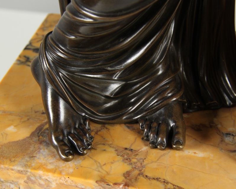 La qualité du travail en bronze est de premier ordre. Les proportions sont parfaitement respectées, le drapé est réaliste. Les détails non vêtus, comme les pieds et les mains, sont remarquablement travaillés. Le bronze à patine sombre contraste joliment avec la pierre claire.