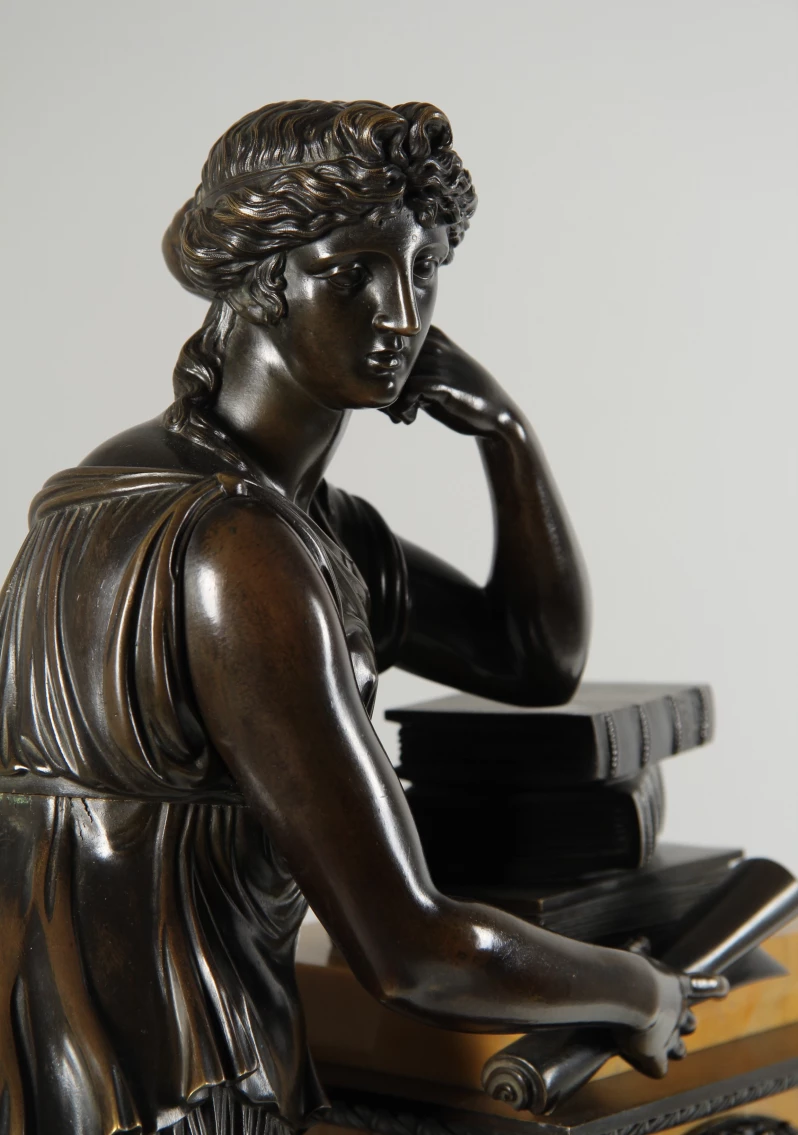 A gauche, une jeune femme se tient sur le socle. Elle s'appuie sur la pile de livres avec son bras gauche et tient un rouleau de papyrus dans sa main droite. Ses cheveux sont relevés et ses traits correspondent à l'idéal de l'Antiquité grecque. Elle est vêtue d'une tunique nouée sous la poitrine, dont le tissu léger rend palpables ses jambes croisées.