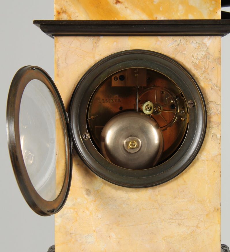 L'horloger Lesieur H(orloger) à Paris a signé au-dessus du VI ainsi que sur la platine arrière du mouvement.