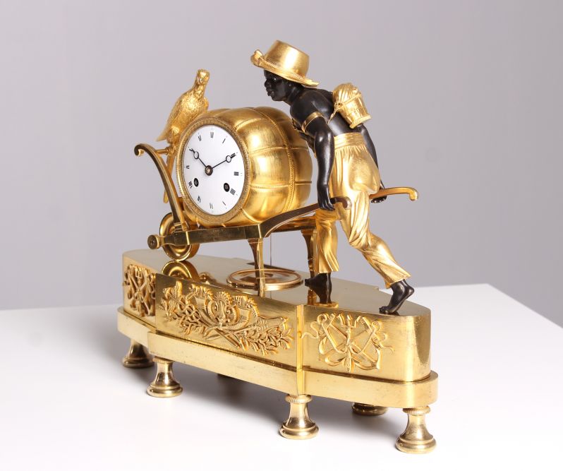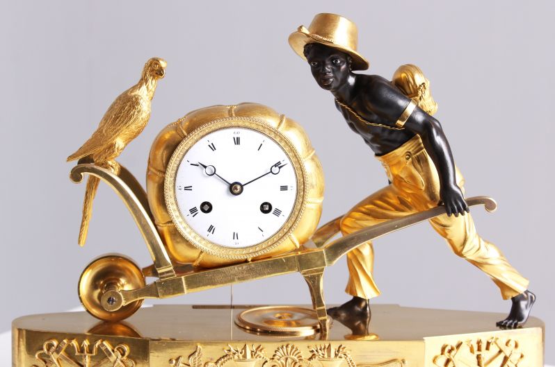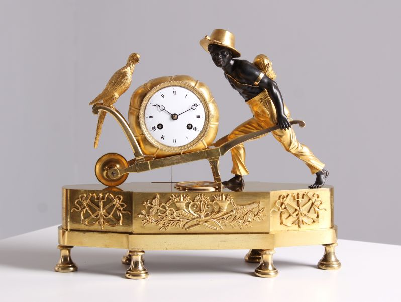 Comme on ne remettait pas assez en question socialement des thèmes comme le commerce colonial et l'esclavage à l'époque de la création de cette pendule, les représentations des pendules dites "Au bon Sauvage" étaient également considérées sans esprit critique. Outre la représentation de la brouette, il existe de nombreuses autres pendules qui traitent du thème de la colonisation. D'autres thèmes du "nouveau monde" ont également été traités artistiquement - animaux et plantes exotiques - papillons, oiseaux du paradis, tabac et épices...