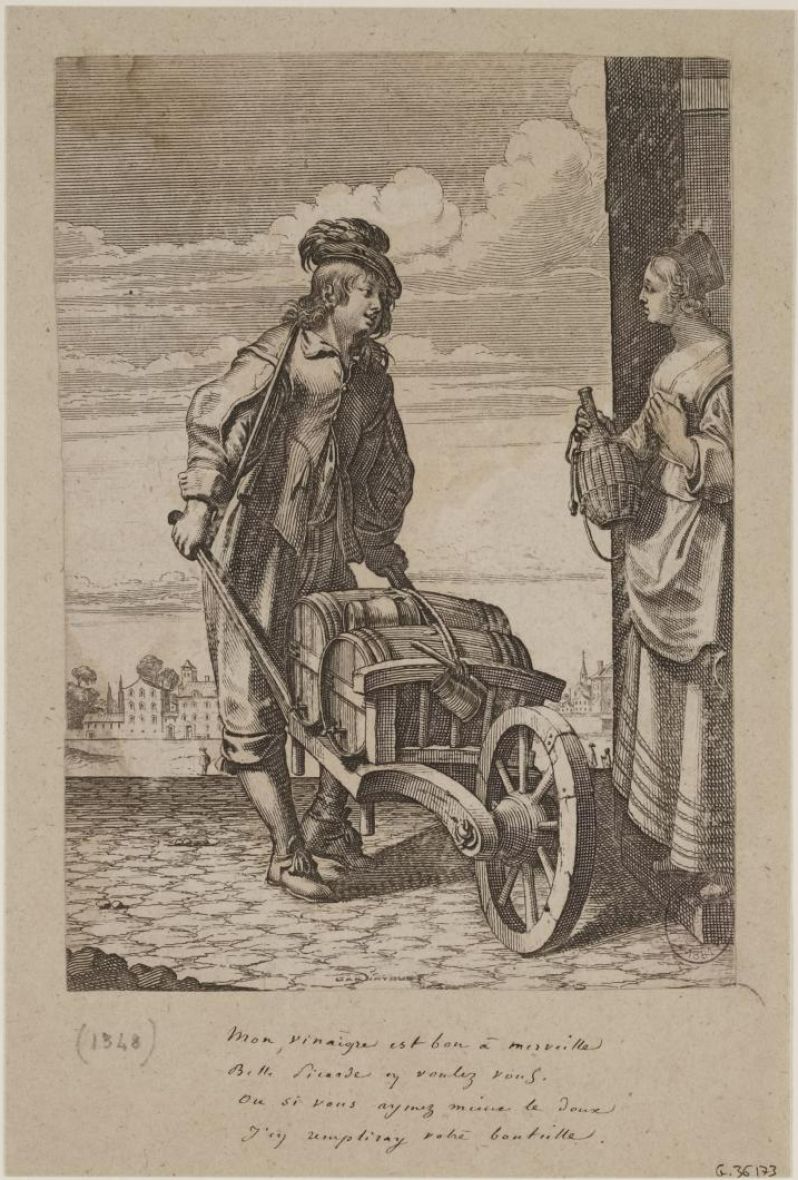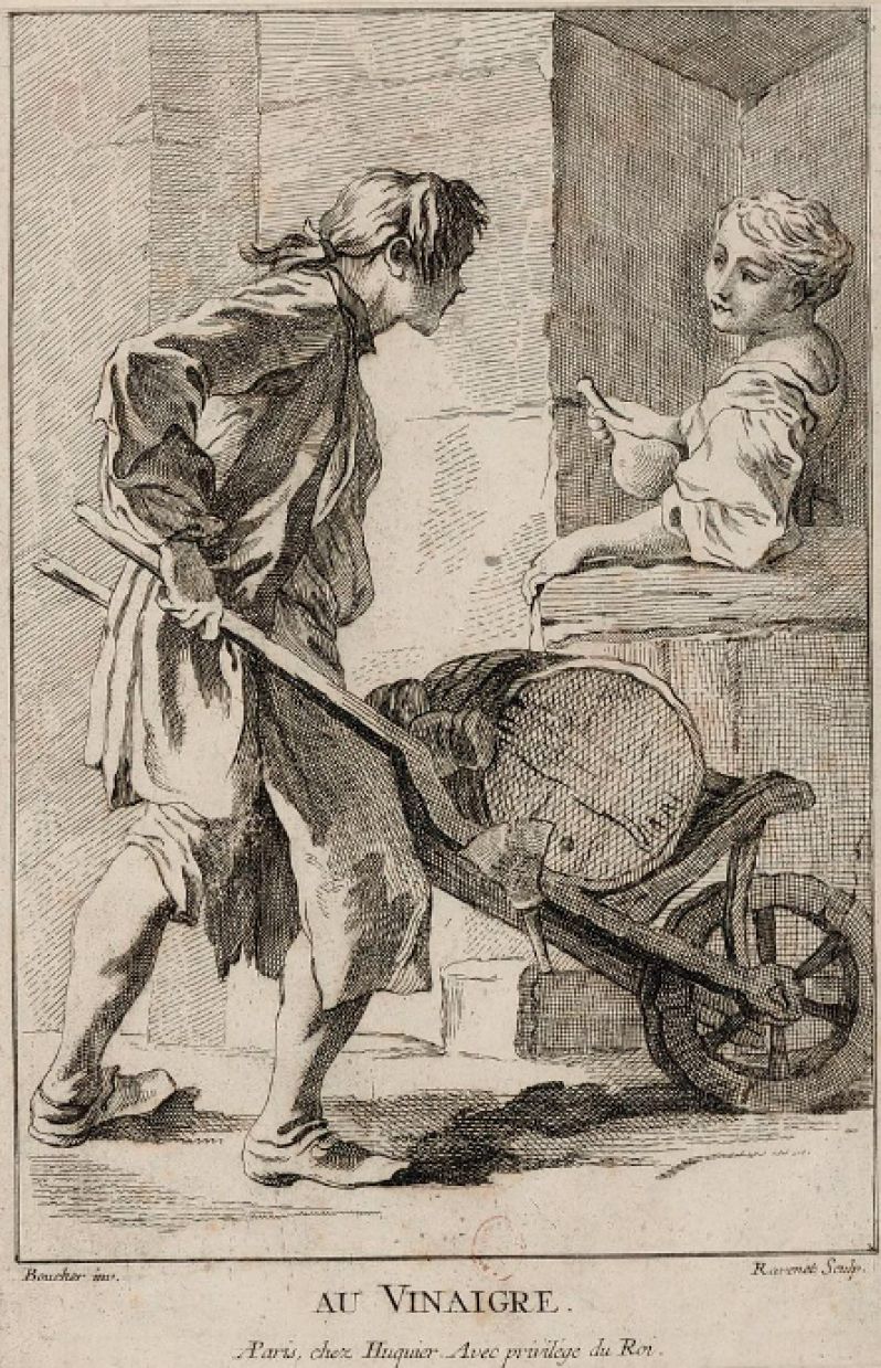 Le motif de la charrette provient en fait de la vie quotidienne des gens simples à Paris. Ainsi, les commerçants et les artisans parcouraient les rues en criant et en chantant et proposaient leurs marchandises et leurs services. Le mode de vie romancé des commerçants appelants en a fait un motif populaire dans l'art. On connaît déjà des gravures sur cuivre des 17e et 18e siècles, entre autres d'Abraham Bosse (1604-1676) ou de François Boucher (1703-1770), qui montrent des vendeurs avec un vinaigrier sur une brouette.