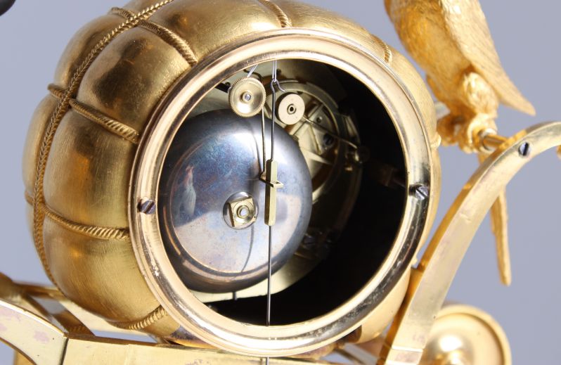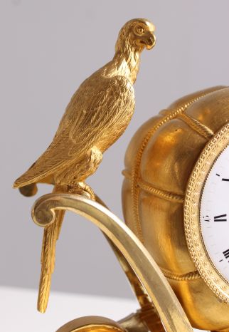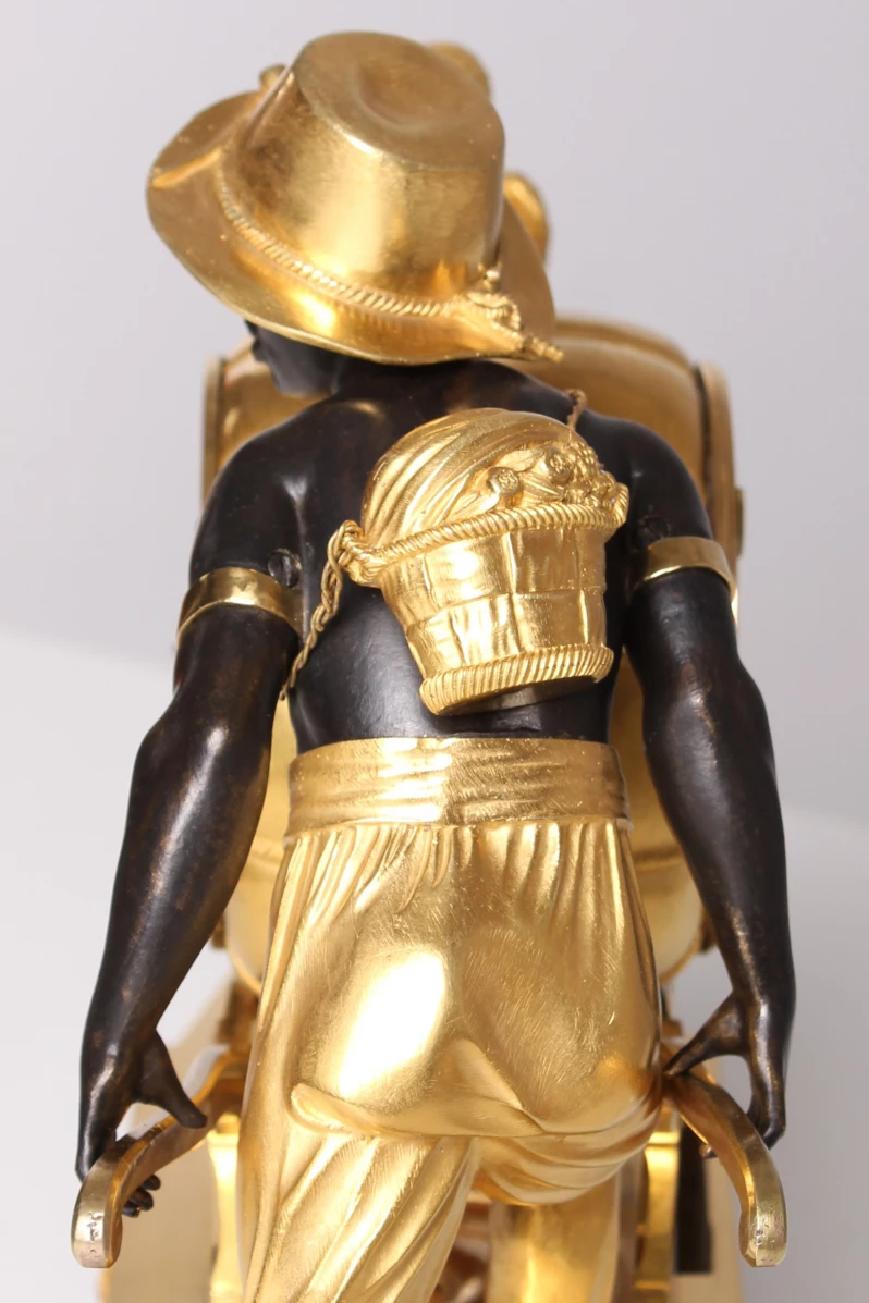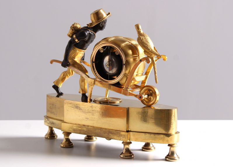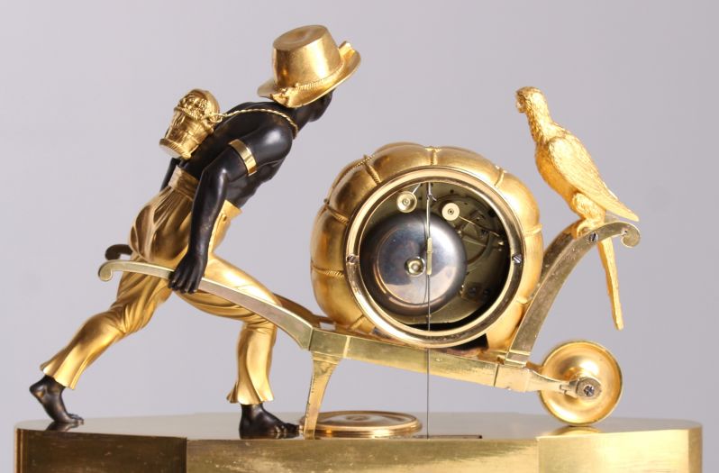 Mais c'est la représentation en bronze entièrement sculptée au-dessus qui retient l'attention. Elle représente un jeune homme poussant une brouette avec une balle de coton. Un perroquet est assis à l'avant de la charrette. Le mouvement de l'horloge est encastré dans la balle, le pendule oscille à travers une ouverture sous le socle.