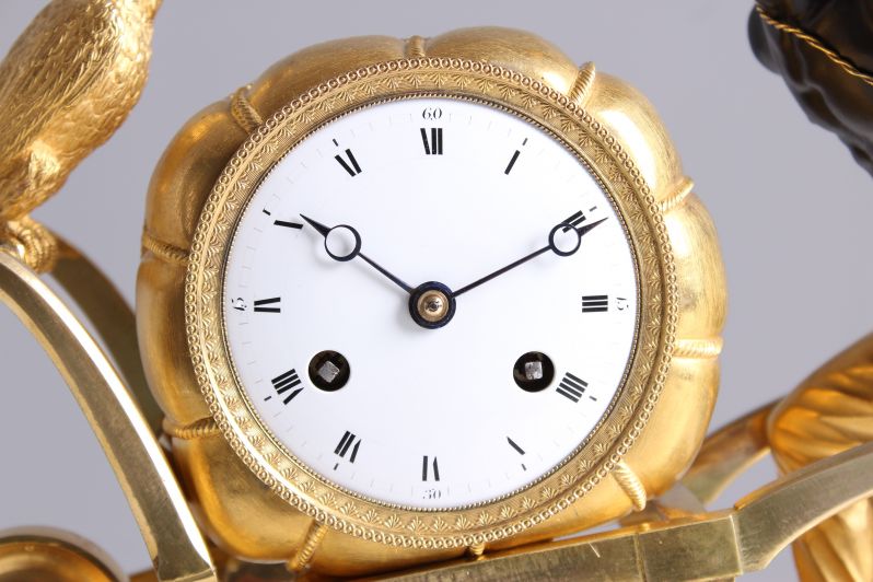 La grande qualité du travail en bronze et l'équilibre de la composition globale sont impressionnants. La patine sombre du corps contraste magnifiquement avec la dorure à chaud d'origine et le blanc du cadran émaillé.