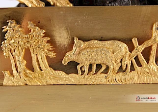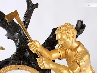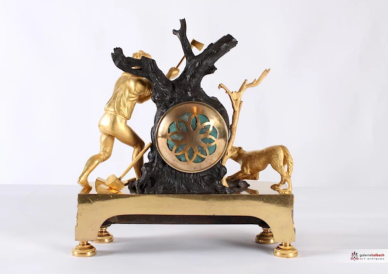 Cette horloge montre un ouvrier forestier qui est surpris par un loup pendant son travail. Mais au lieu d'avoir peur, il se dirige vers le loup avec détermination et la hache levée. Le vent tourne. Soudain, le loup est vaincu.