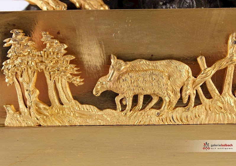 Socle reposant sur des pieds finement ciselés, avec des scènes de loups, de moutons et de bergers représentées en applications.