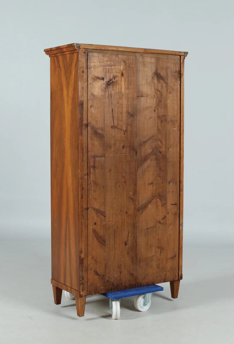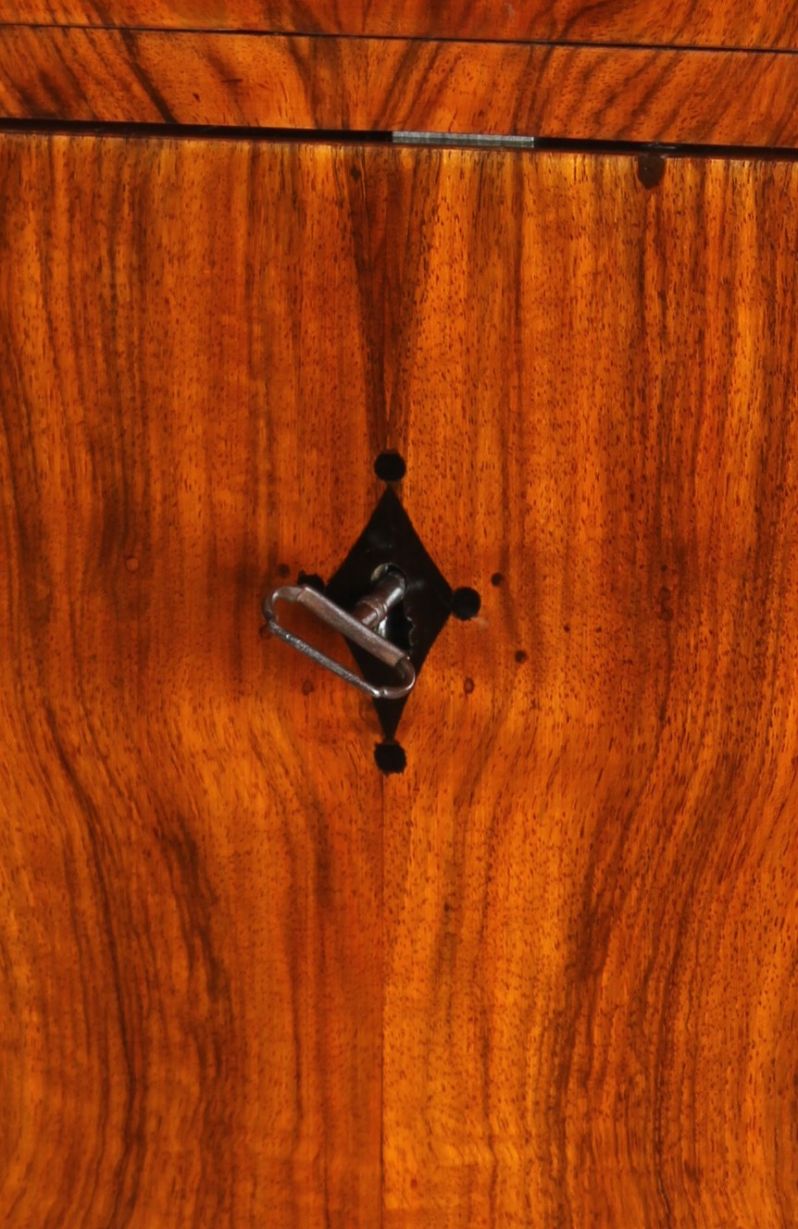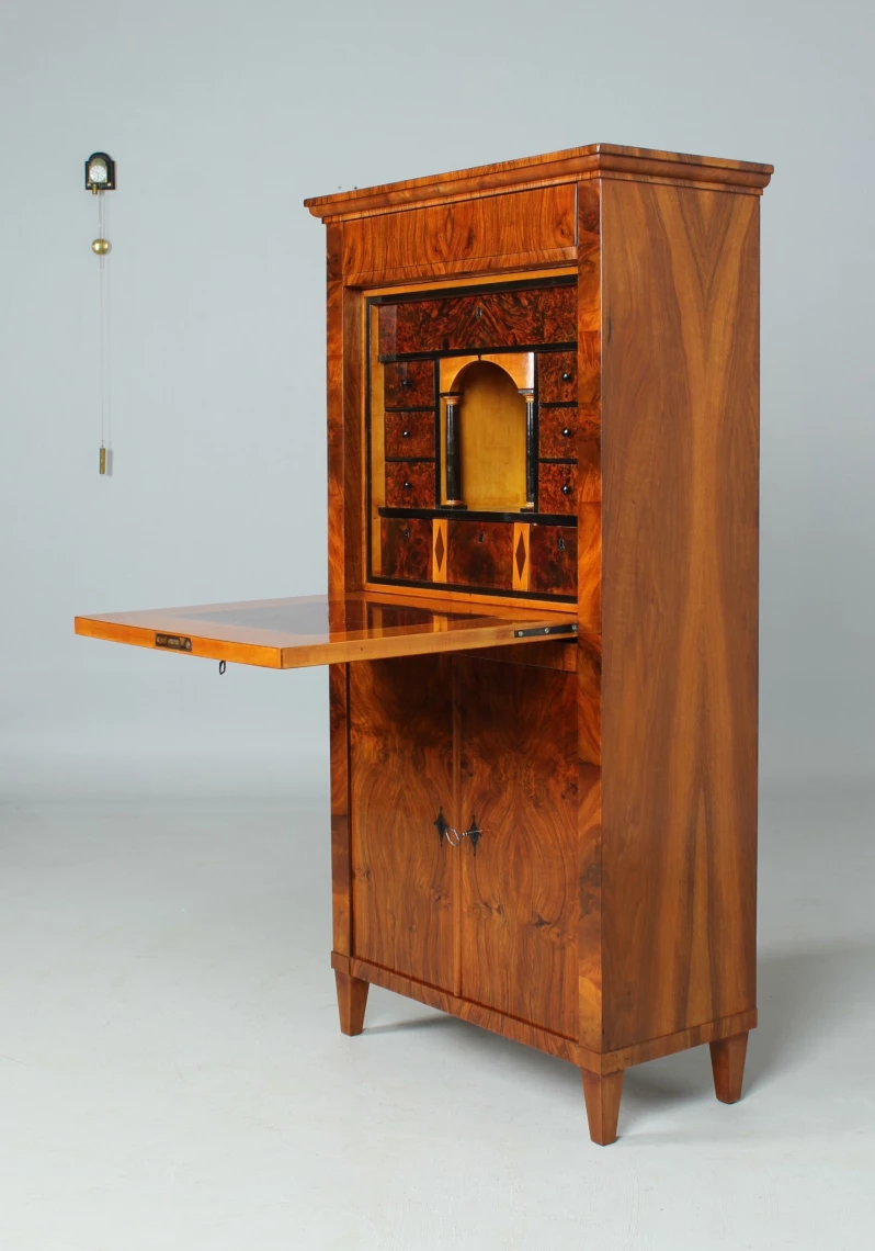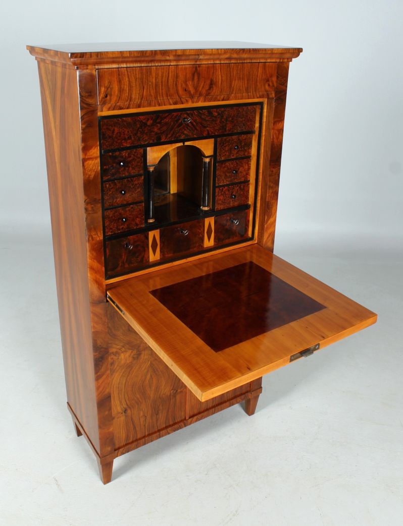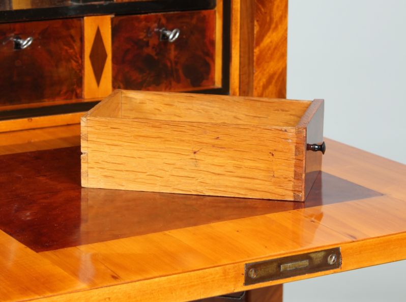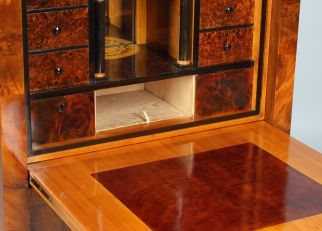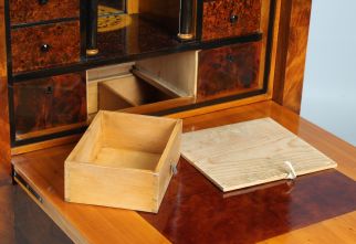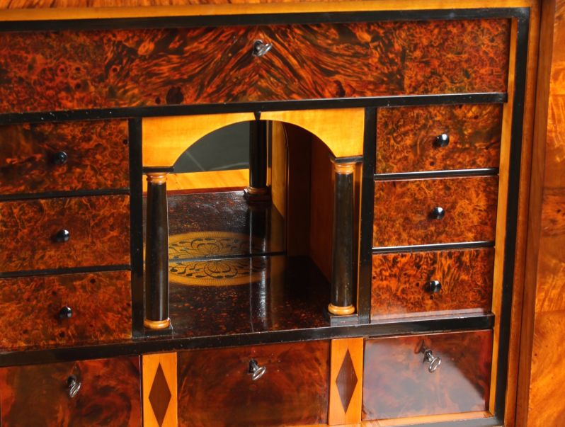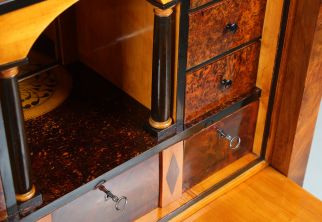 Derrière le volet d'écriture, nous voyons un intérieur bien rangé. Le compartiment central est flanqué de colonnes pleines ébonisées et est recouvert d'un miroir à l'arrière. Le fond du compartiment est marbré de manière exceptionnelle. Grâce au miroir, le cercle de l'ornementation merveilleusement finement peinte à l'arrière se referme.