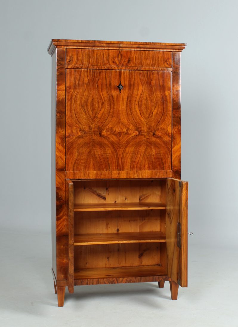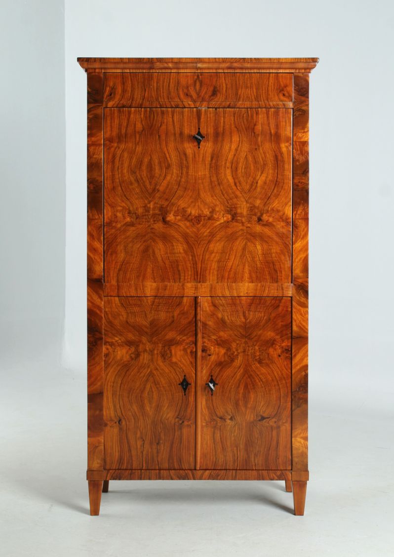 Meuble reposant sur des pieds pointus avec deux portes en bas, le volet d'écriture situé au-dessus et un tiroir de tête tout en haut.