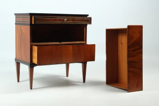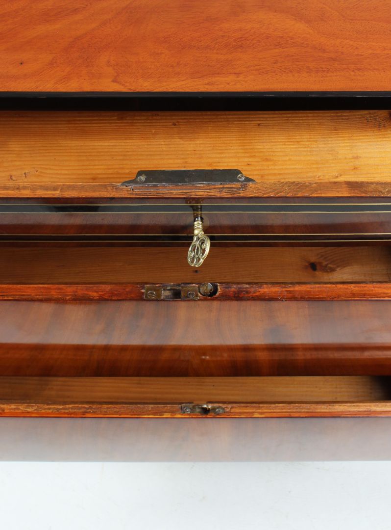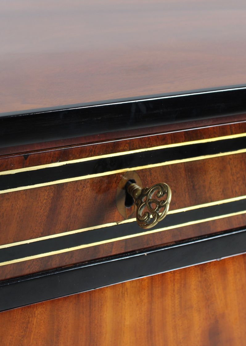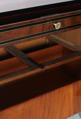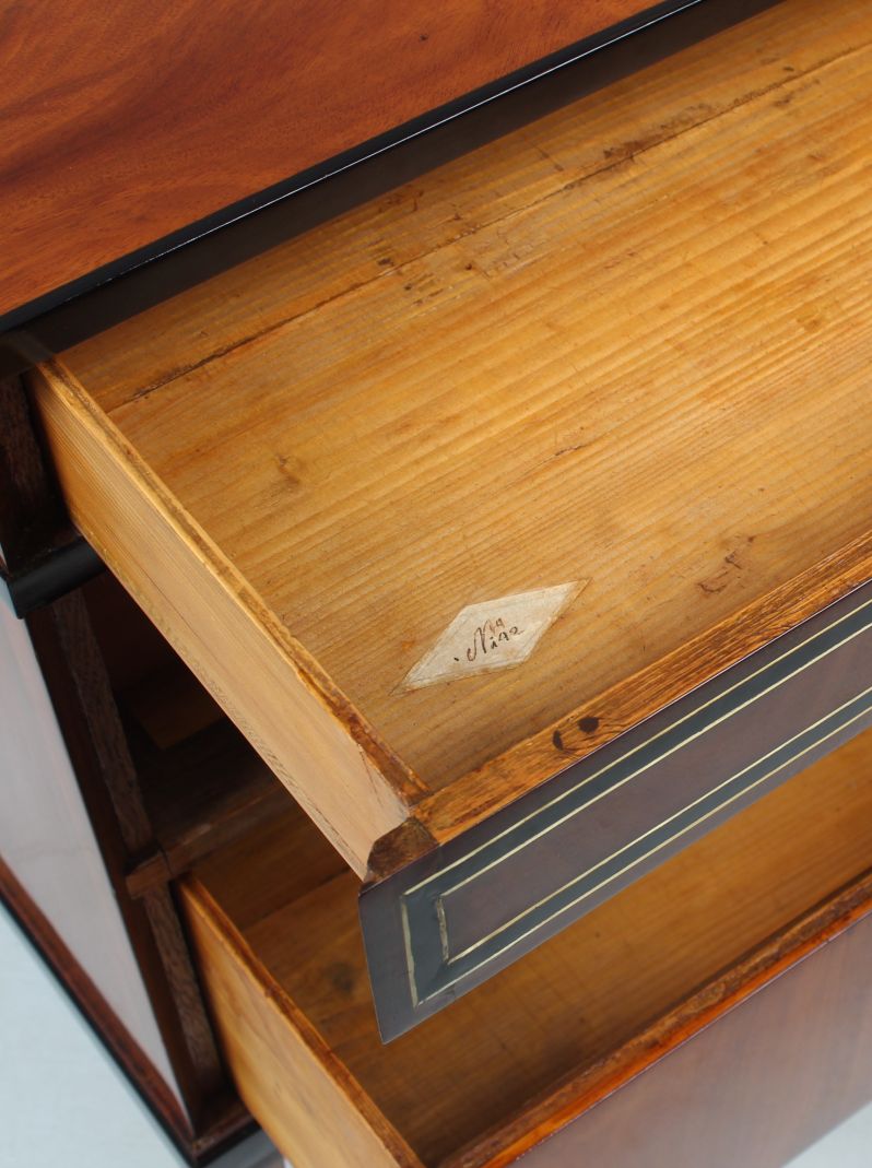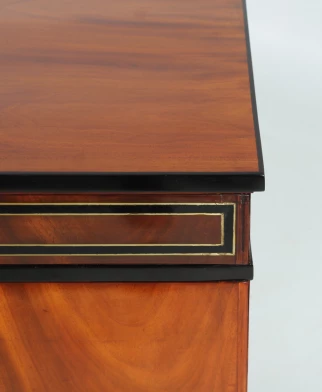 Nous voyons un veinage très calme, simplement reflété, du bois d'acajou clair sur la façade. Le socle, le bord du plateau et la traverse sous le tiroir supérieur sont ébonisés et contrastent avec le bois. Le tiroir supérieur a un large cadre en laiton et en bois foncé. Cette conception se poursuit sur les côtés du meuble.