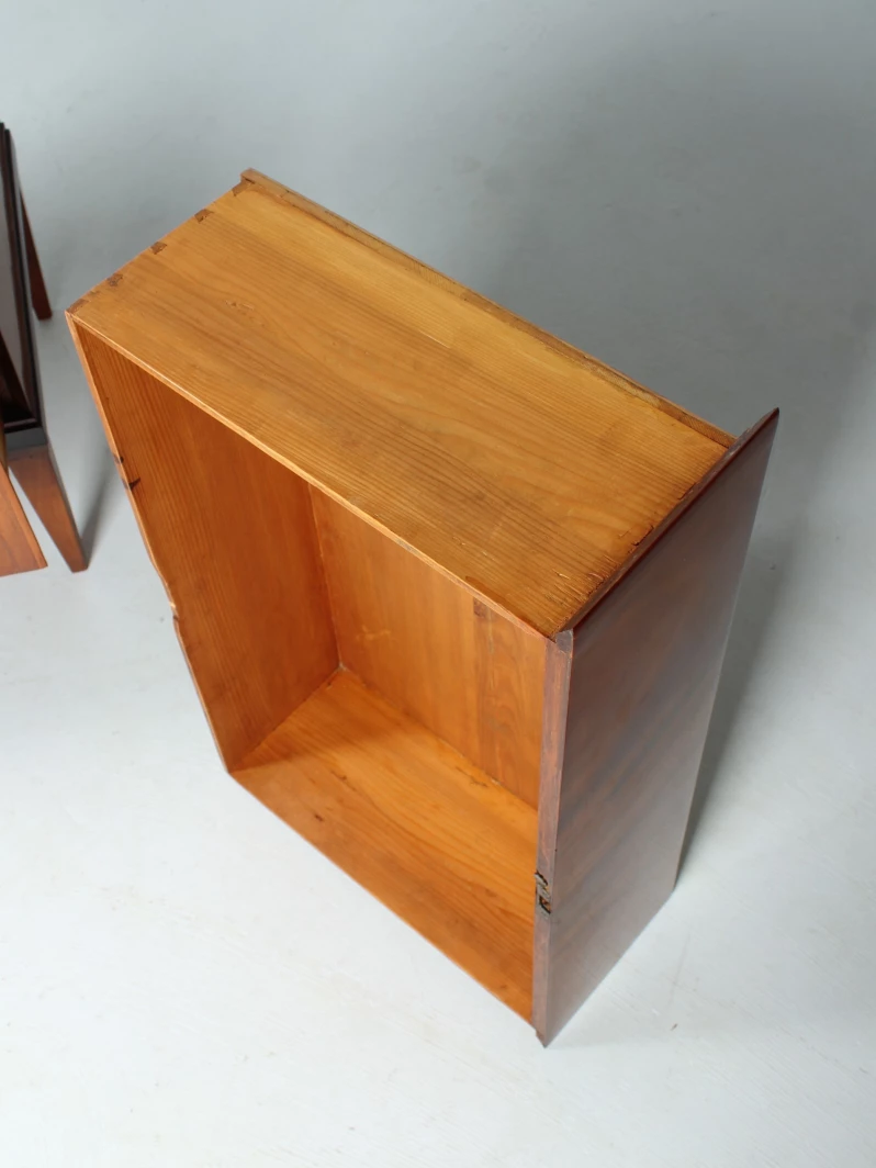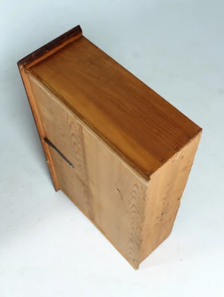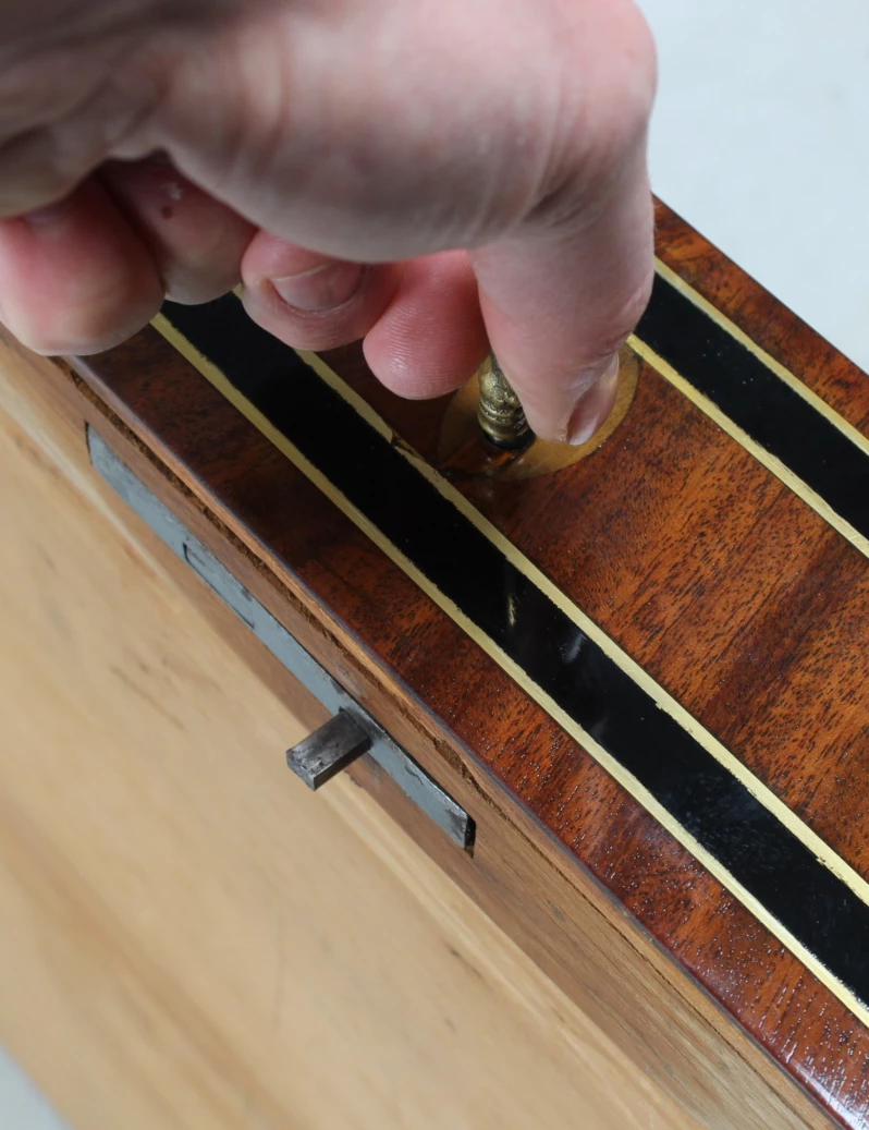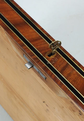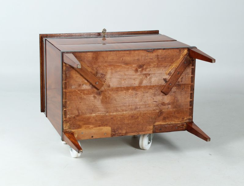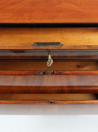 Sur la façade, on remarque les deux tiroirs sans poignée et sans serrure. Tous les tiroirs s'ouvrent à l'aide de la serrure du tiroir supérieur, qui actionne un intéressant mécanisme de fermeture dissimulé.