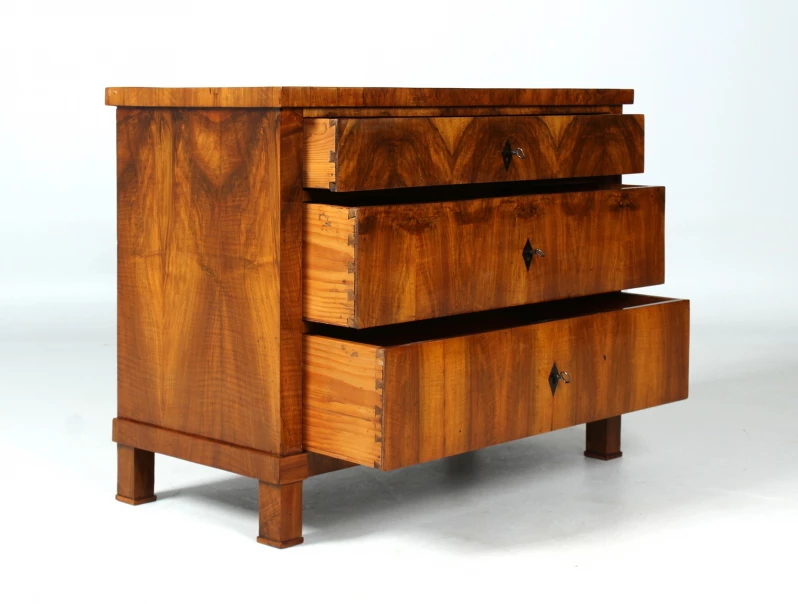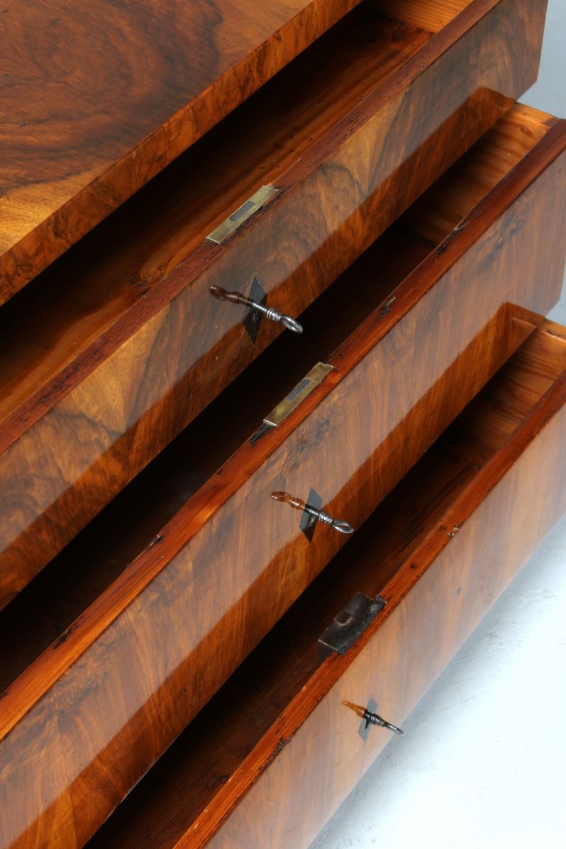 Nous voyons un bois de noyer harmonieusement posé non seulement sur la façade, mais aussi sur les côtés et le dessus du meuble. Les veines de la façade du meuble sont posées en continu du socle aux tiroirs et aux traverses. Il est discrètement interrompu par les plaques à clés en forme de losange, incrustées dans le bois d'ébène.
