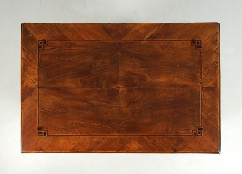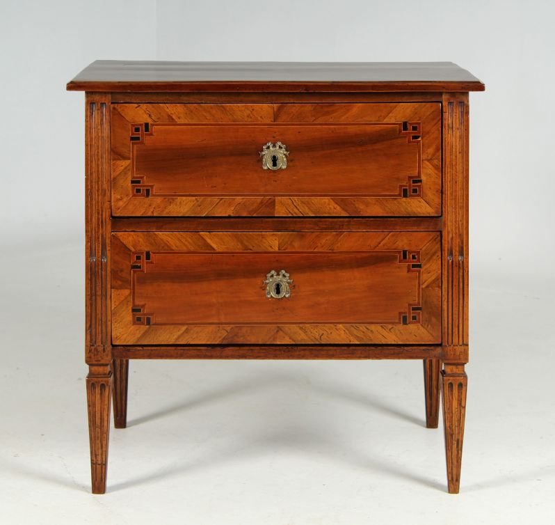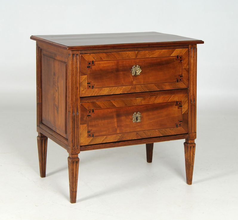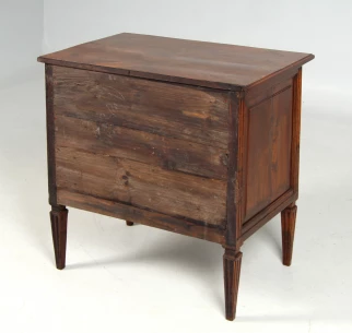 Les ferrures Louis Seize en bronze créent un beau contraste dans le bois sobrement veiné. La conception des façades de tiroirs se retrouve également sur le plateau supérieur du meuble.
