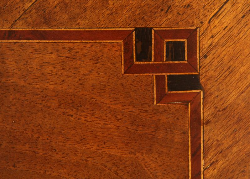 Les façades des tiroirs sont à simple champ et décorées d'incrustations de bandes géométriques sinueuses. Les champs plaqués dans le sens de la largeur sont encadrés par un large cadre dont les veines sont disposées en diagonale et symétriquement les unes par rapport aux autres.
