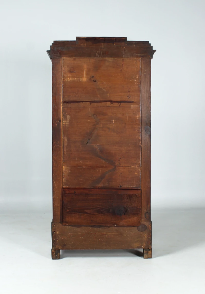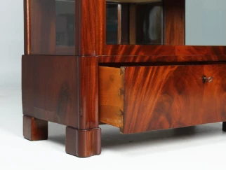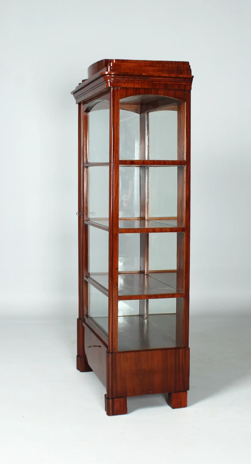 Armoire vitrine reposant sur des pieds blocs et vitrée sur trois côtés. D'une largeur de 80 cm seulement, ce meuble est particulièrement délicat.