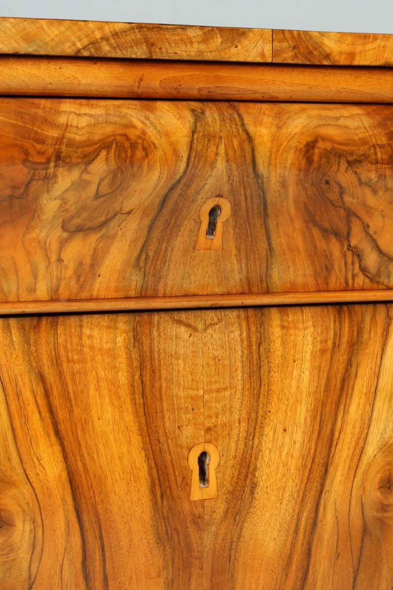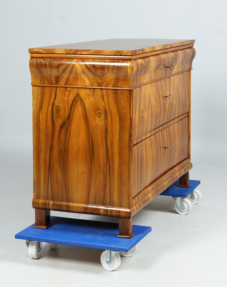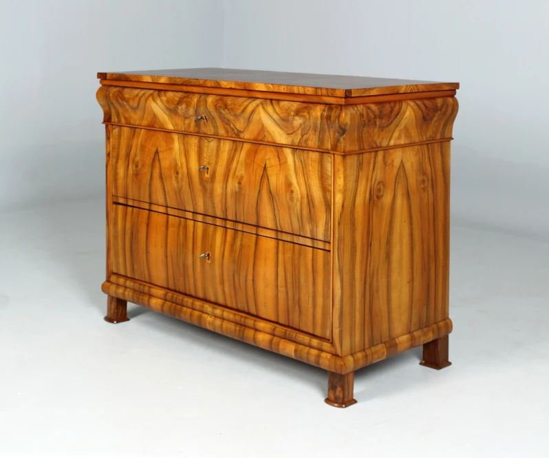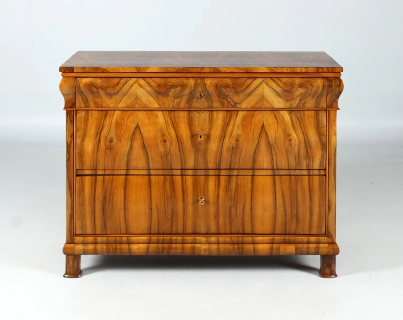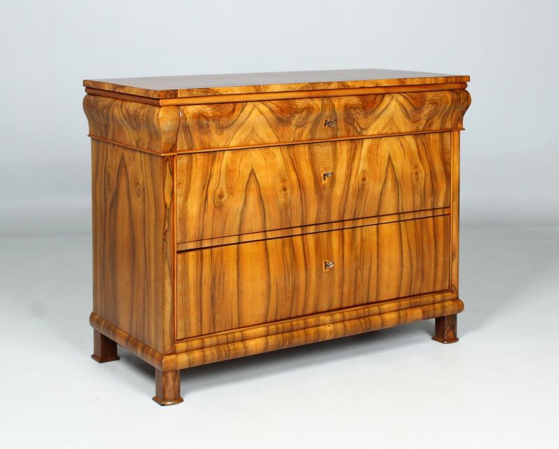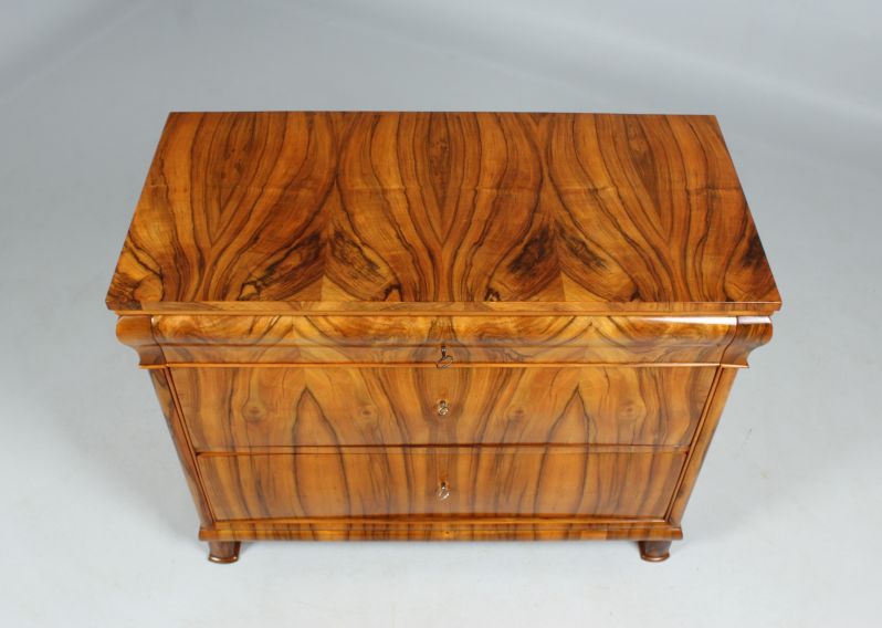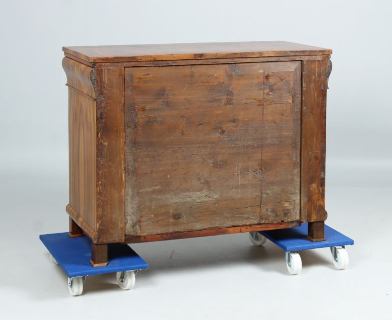 Deux choses attirent directement l'attention sur cette commode. D'une part, l'impressionnant motif de veines de noyer qui s'étend en parfaite symétrie non seulement sur la façade, mais aussi sur les côtés et le plateau supérieur, découpé dans le même tronc. D'autre part, il y a la forme exceptionnelle avec la plinthe arrondie et la partie fortement bombée sous le plateau supérieur. Cette conception est tout à fait typique du Palatinat à la fin de l'époque Biedermeier.