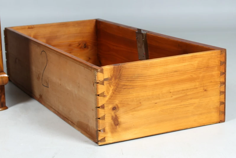 Les encadrements en trou de serrure en érable sont discrets. Les façades des tiroirs sont légèrement gauchies en raison de l'âge.