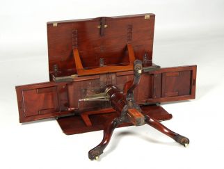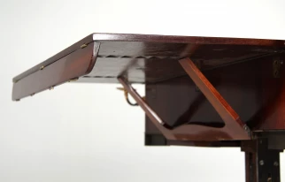 Posée sur un piètement à roulettes et à trois pieds, cette table a des plateaux rabattables à la manière d'une table Pembroke. Si nous soulevons les plateaux, les supports situés en dessous et montés sur ressorts suivent automatiquement. Les plateaux peuvent être bloqués à différents degrés d'inclinaison, jusqu'à la position complètement horizontale, ce qui permet d'obtenir un plateau de table d'une largeur de 97 cm. Les barres d'extrémité du plateau, également mobiles, peuvent être utilisées comme serre-livres.