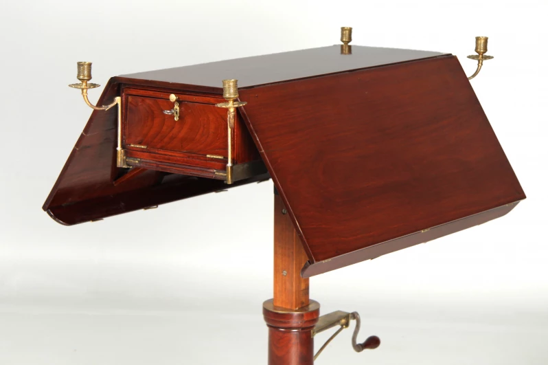 Outre deux pupitres à musique, deux tiroirs et deux plateaux plats peuvent être extraits du cadre haut du meuble. Il y a également un abattant qui offre un espace de rangement pour des objets un peu plus grands.
