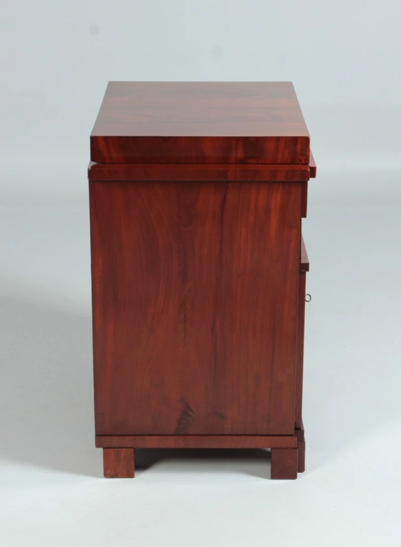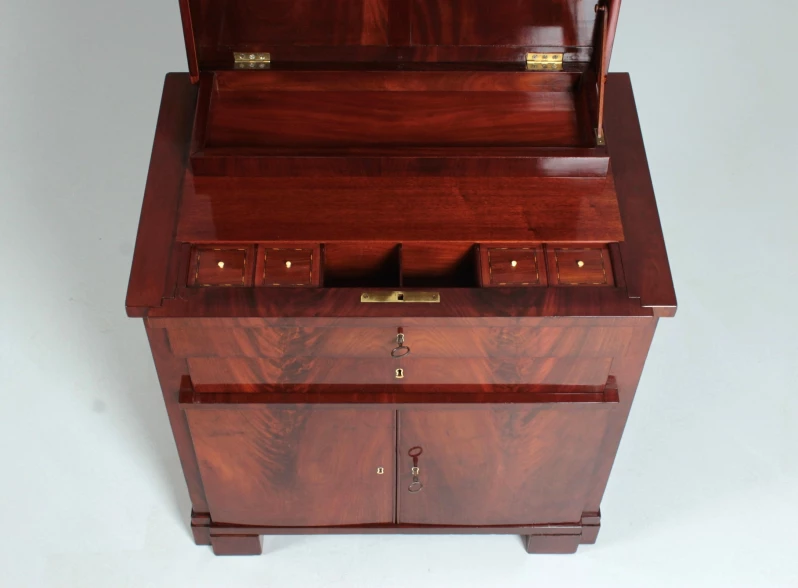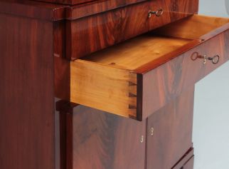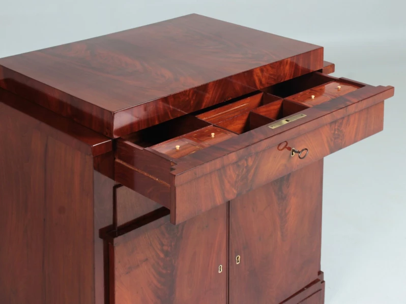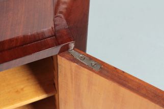La façade plane est interrompue par des portes et des tiroirs, en partie en saillie et en partie encastrés, typiques de l'époque et de la région. Les pieds pliés en angle sont également typiques de l'époque. L'acajou de Cuba très expressif est posé de manière absolument symétrique et ne s'étend pas seulement sur toute la façade du meuble, mais poursuit également le tracé des veines sur le dessus du plateau. De discrètes plaques de clé en ivoire créent des contrastes de couleur.