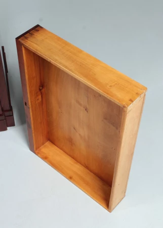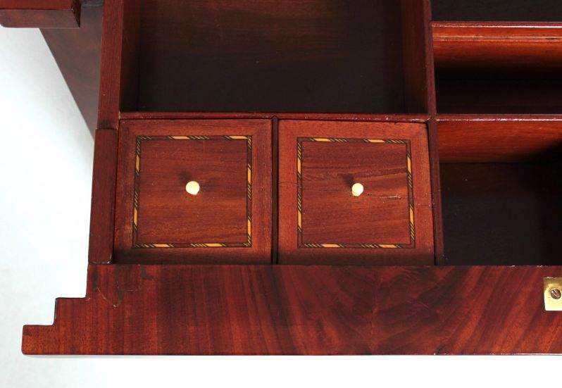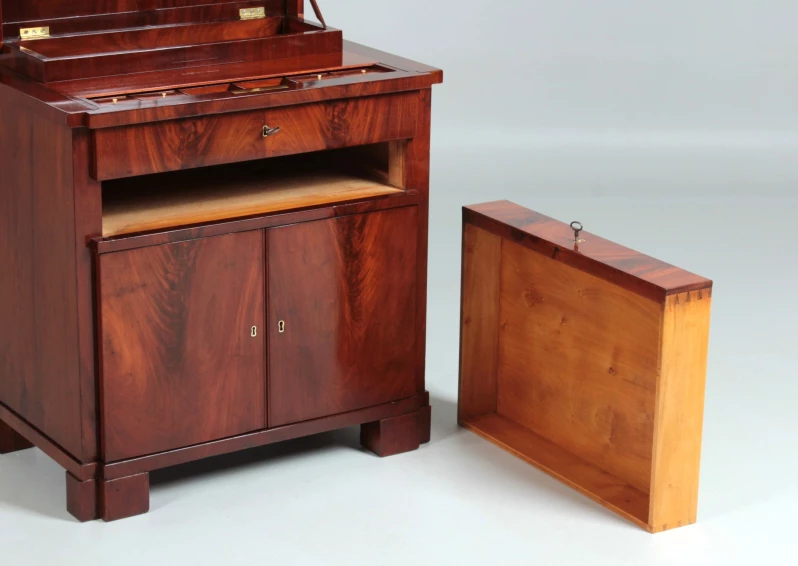 Sous le couvercle se trouve à l'arrière un large compartiment ouvert. Le tiroir supérieur contient de petits compartiments couverts ainsi que de petits tiroirs intérieurs.
