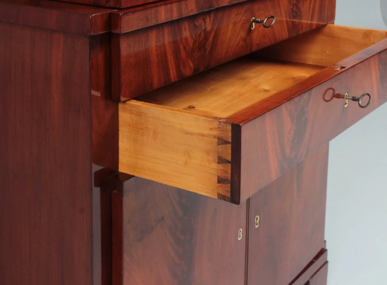 Il convient également de mentionner la serrure exceptionnelle du tiroir supérieur. D'un côté, il s'agit d'une serrure à crochet pour verrouiller le couvercle, de l'autre d'une serrure à pêne dormant pour fermer simultanément le tiroir situé en dessous.