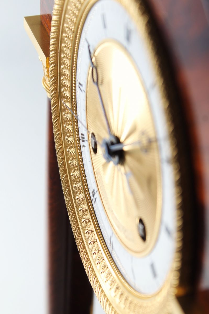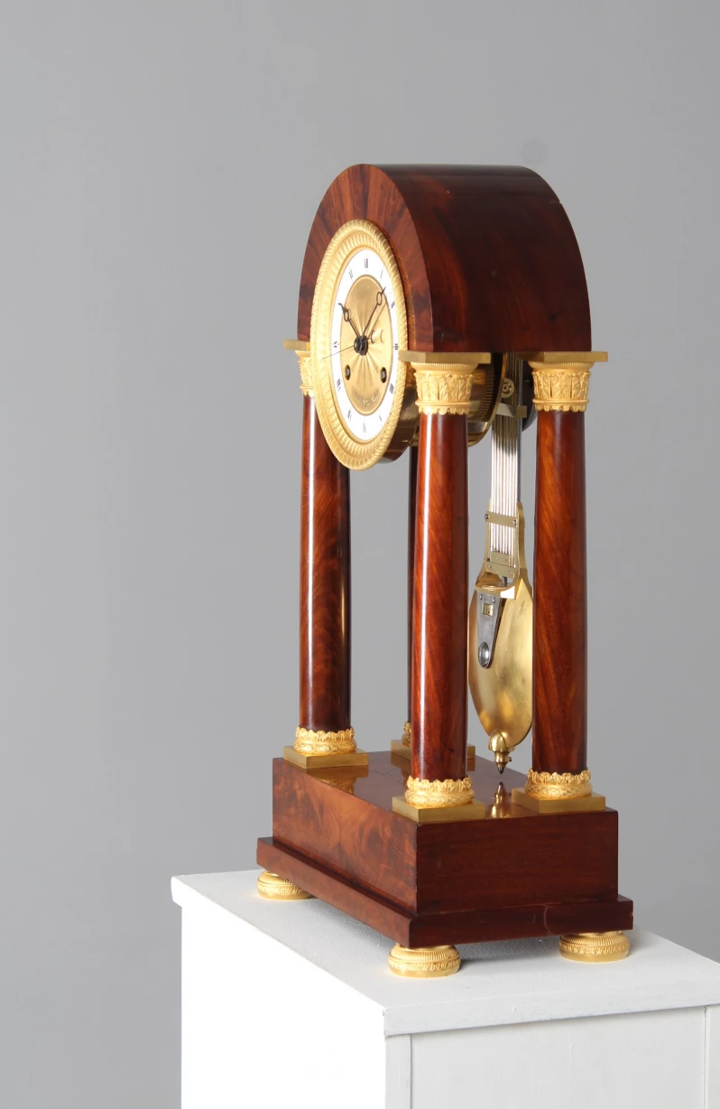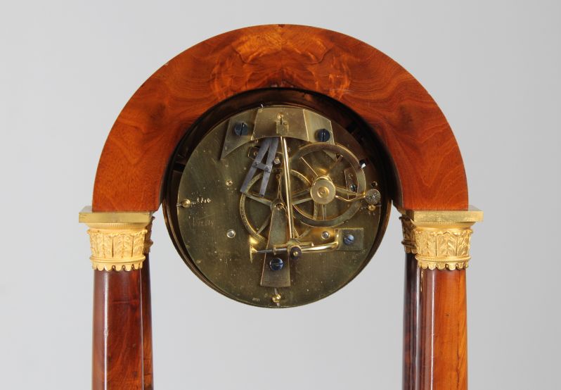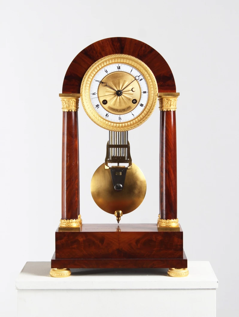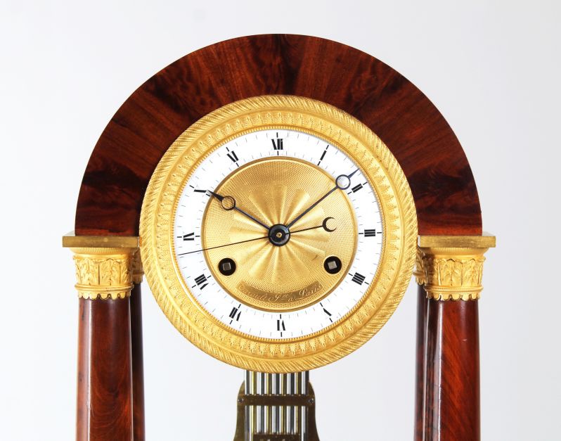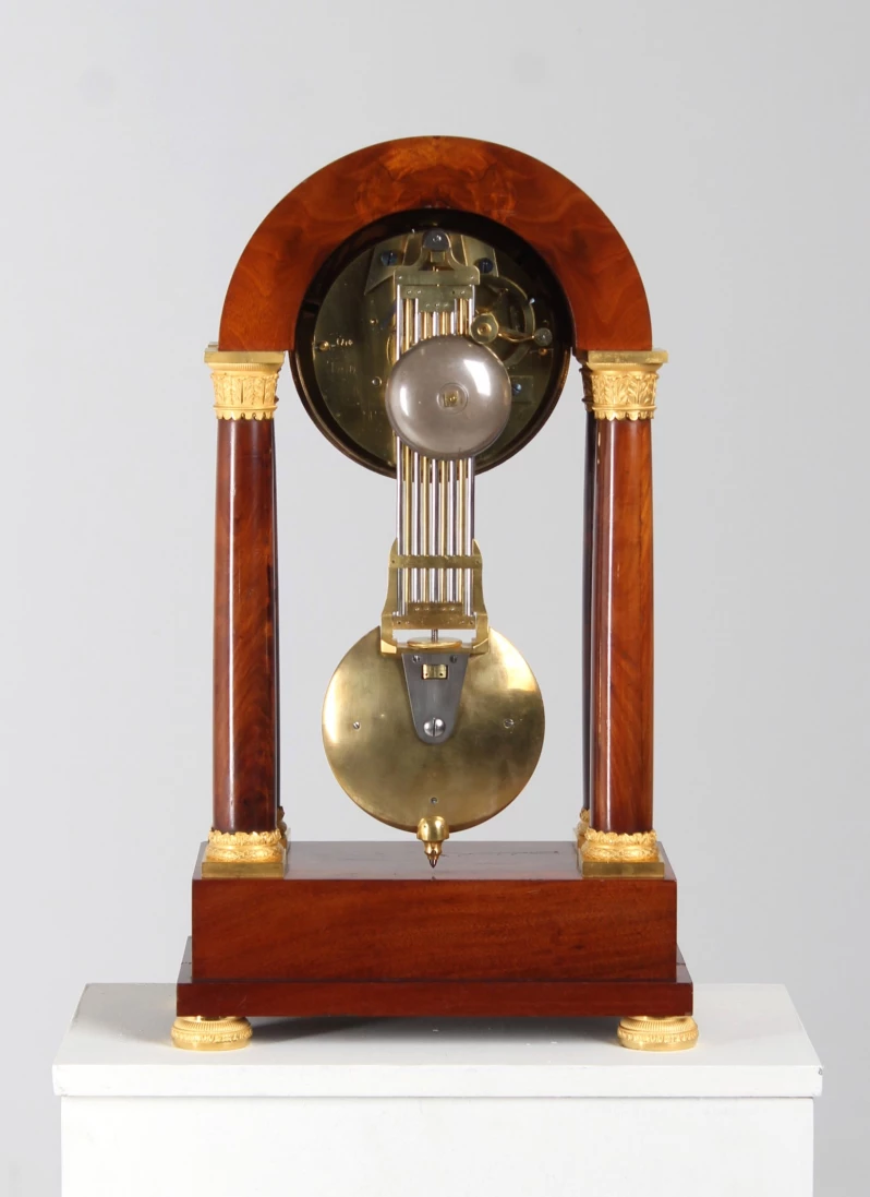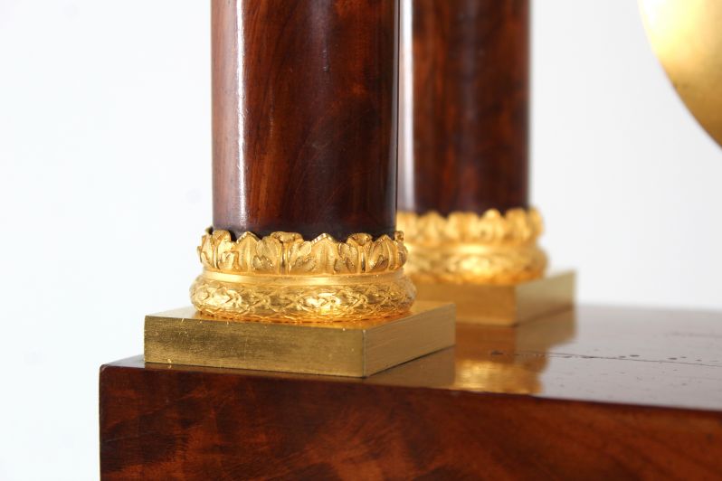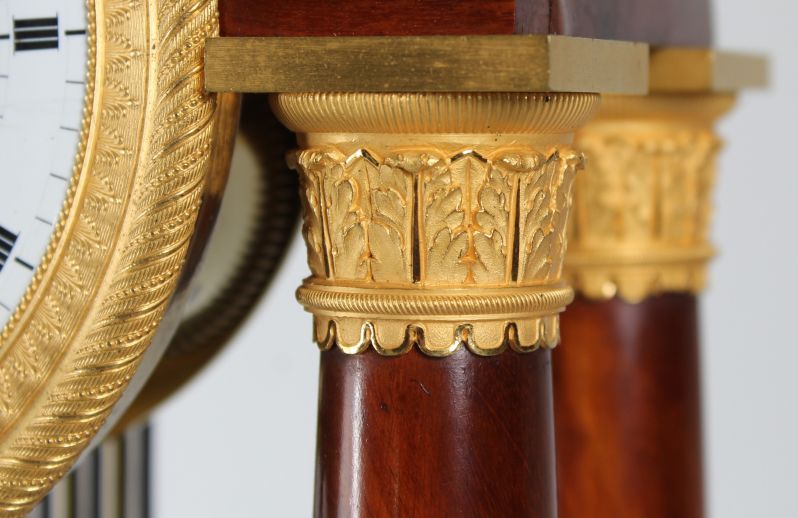 L'arc en plein cintre dans lequel est monté le mouvement est soutenu par des colonnes pleines. Le placage d'acajou proprement posé contraste joliment avec les pièces en bronze finement travaillées et dorées à chaud.