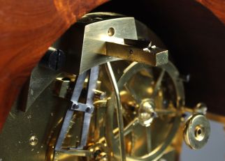 Le réglage de la chute, c'est-à-dire le guidage du pendule réglable au moyen d'une vis moletée, permet de compenser les inclinaisons les plus minimes sur le lieu d'installation de la montre.
