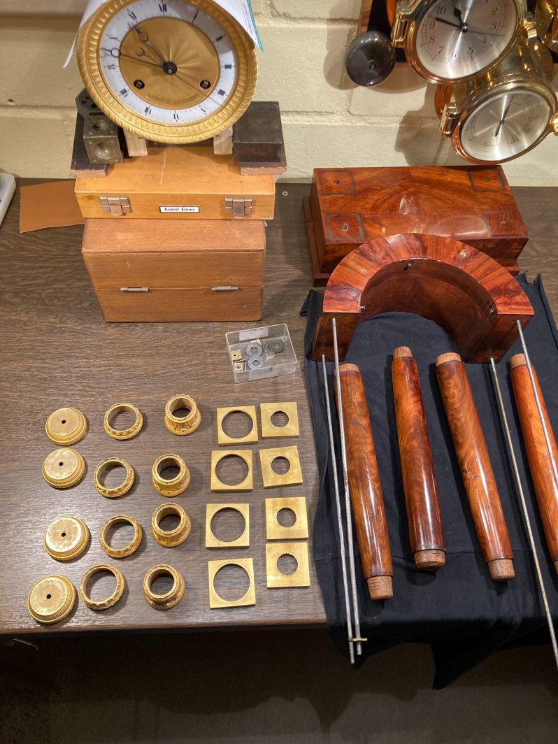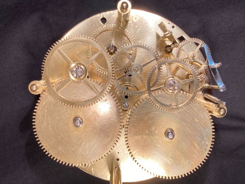 Le mouvement est une pendule française avec échappement à ciseaux, sonnerie à disques de serrure et balancier compensé avec suspension à lames. Il provient de l'atelier Tarault Jeune qui, selon Brian Loomes - Watchmakers and Clockmakers of the World, est attesté de 1807 à 1826 dans la rue St. Denis à Paris.
