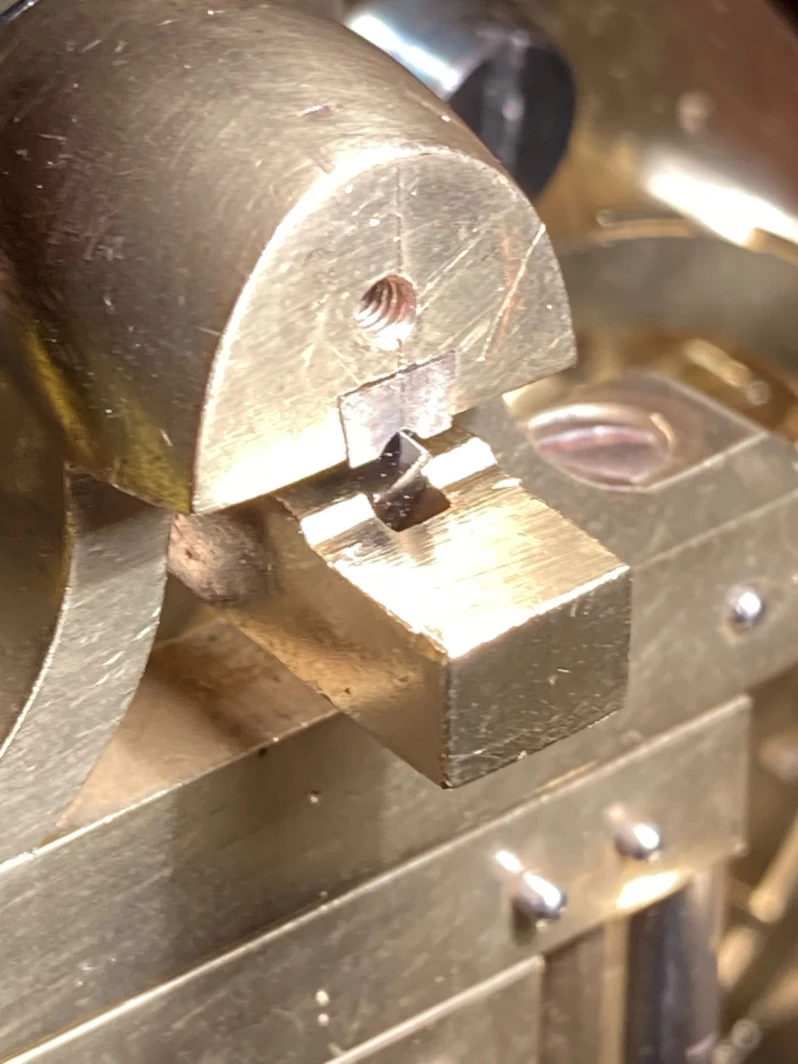 Grâce à sa surface d'appui extrêmement réduite, la suspension de la lame permet un mouvement pendulaire pratiquement sans frottement. Grâce au point de rotation du pendule exactement défini sur le tranchant, il est possible d'effectuer des calculs très précis pour corriger la marche. Sur l'une des photos, on peut voir l'extrémité supérieure du pendule sans le couvercle arrière. La surface d'appui minimale dans la suspension du tranchant est bien visible sur cette photo.