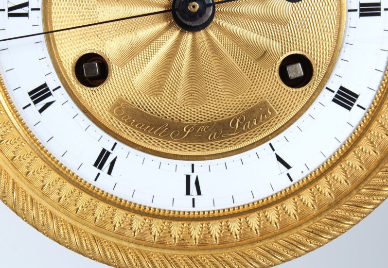 Le cadran émaillé blanc avec minuterie noire, graduation en demi-secondes et chiffres romains des heures est entouré d'une large lunette ornée de palmettes. La surface centrale du cadran est finement guillochée et dorée à chaud. On y trouve également la signature gravée : Tarault Jeune á Paris.