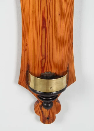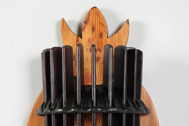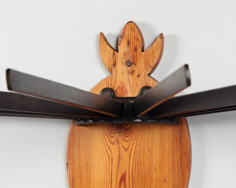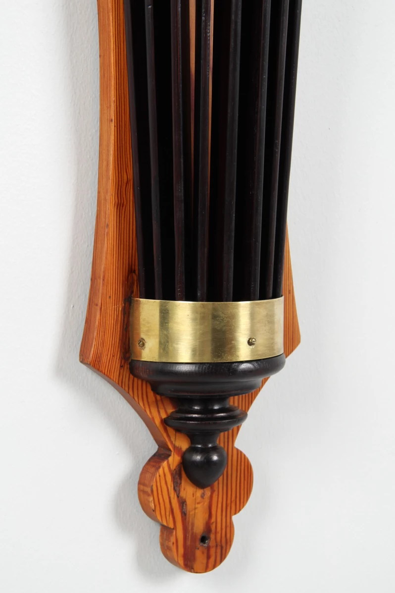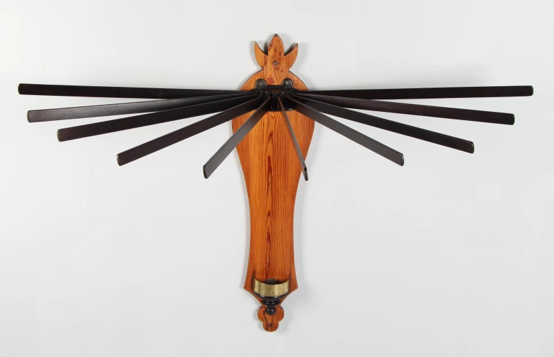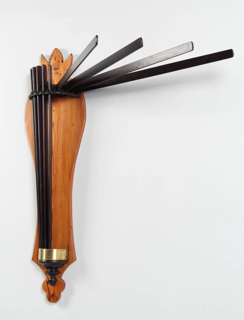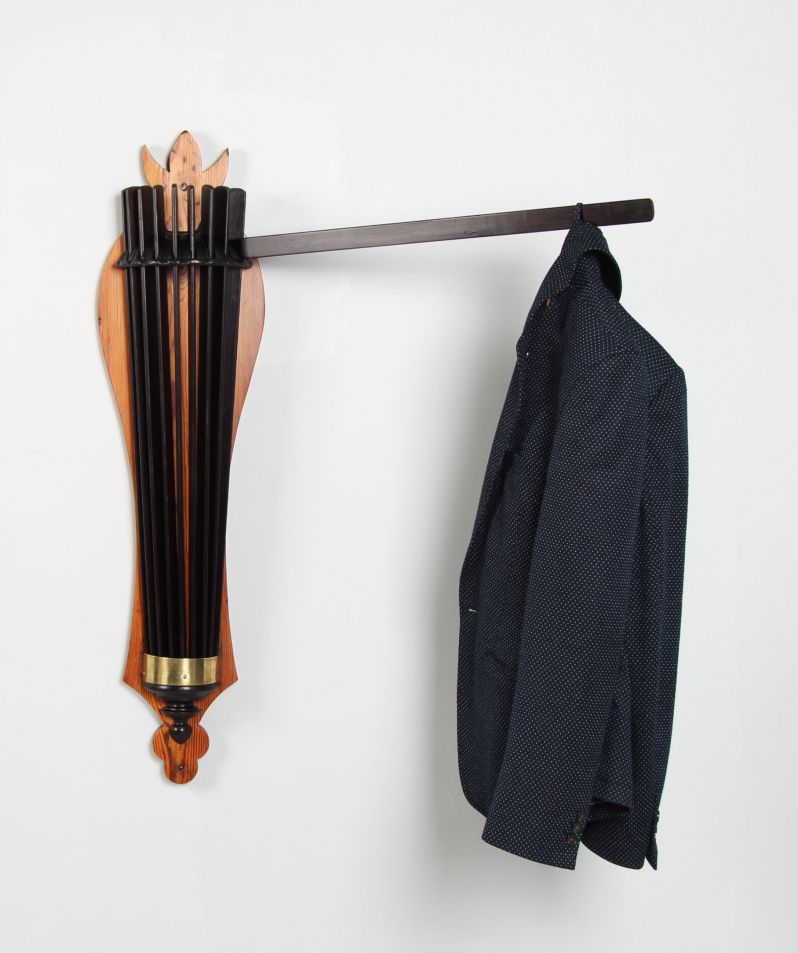 Sur une planche en bois résineux à fixer au mur est monté en bas un logement recouvert de laiton pour les dix bras au total. En haut, les bras ébonisés sont maintenus en position par un support en fonte. Poussés vers le haut et dépliés, ils permettent de suspendre des serviettes ou des vêtements pour les faire sécher.