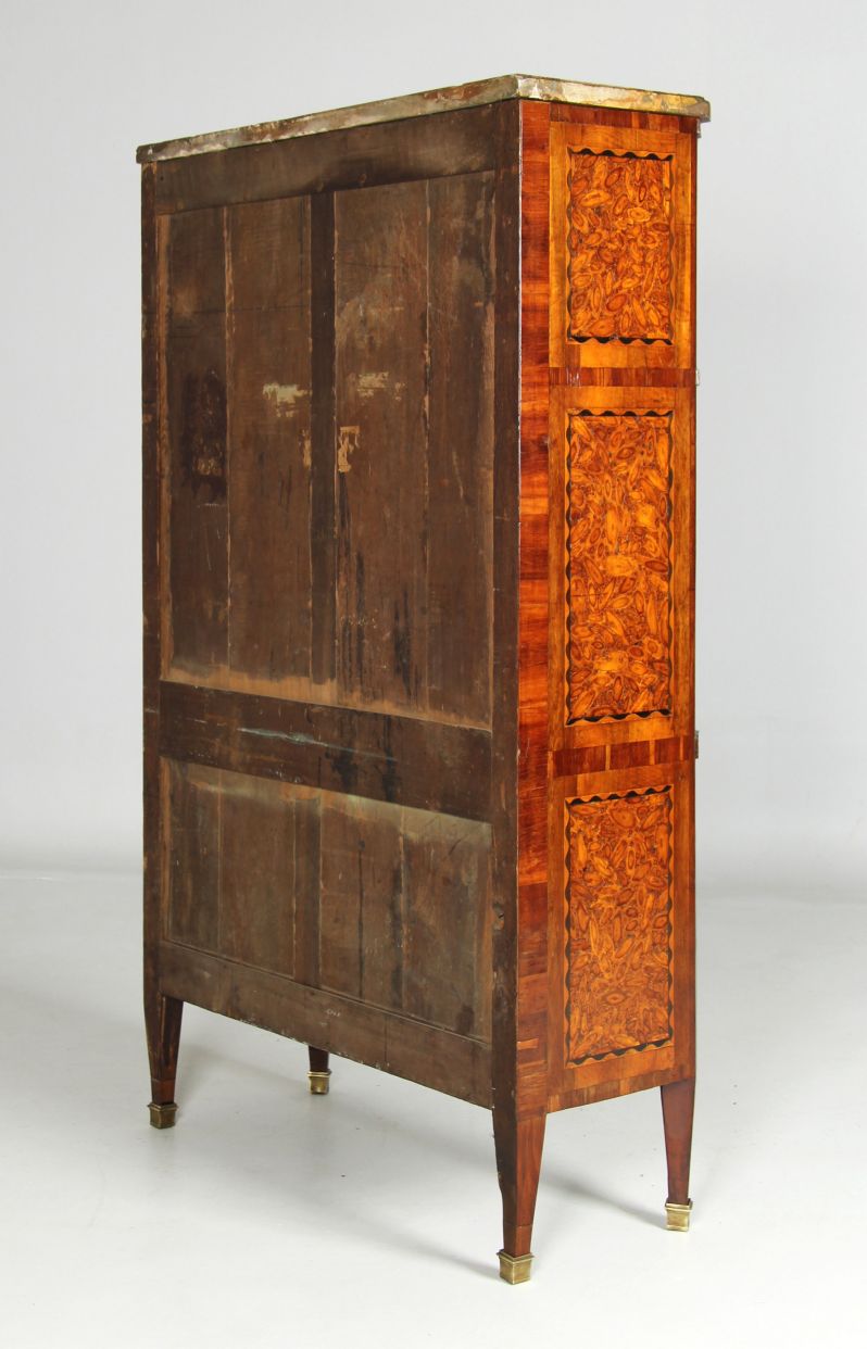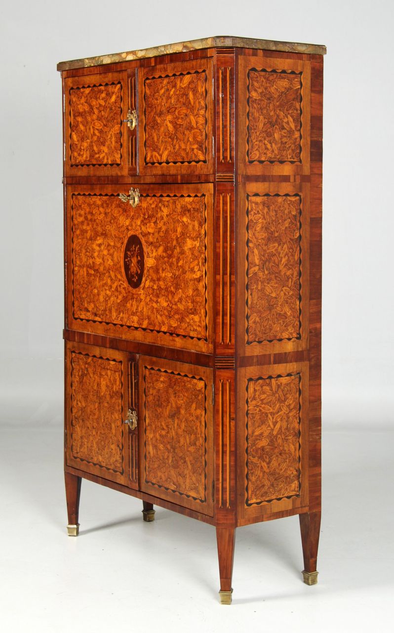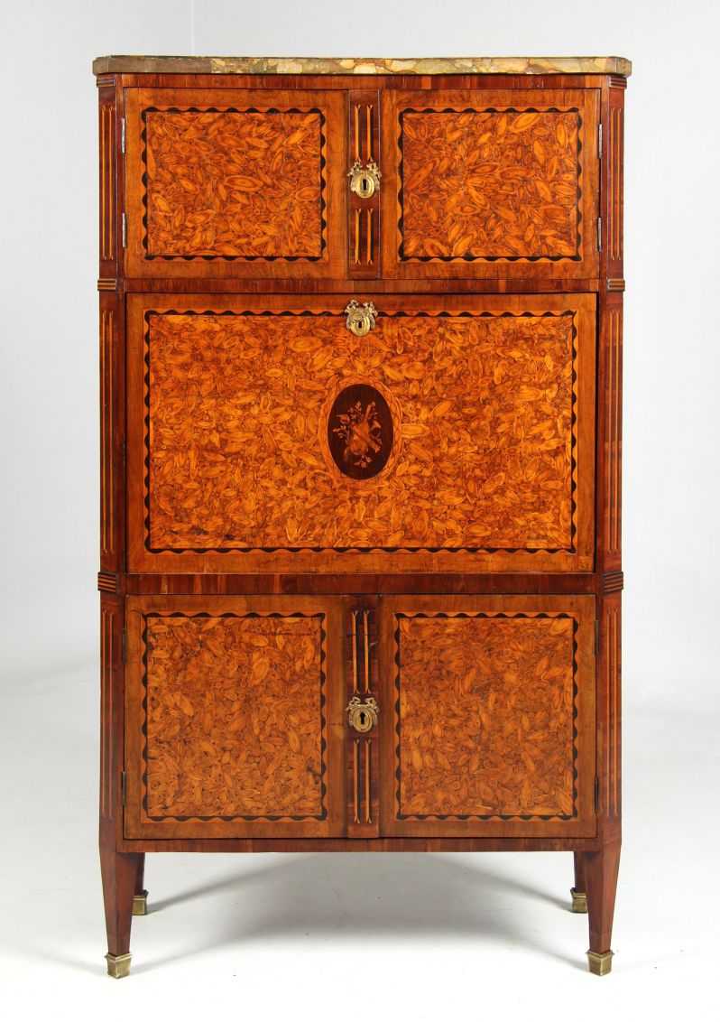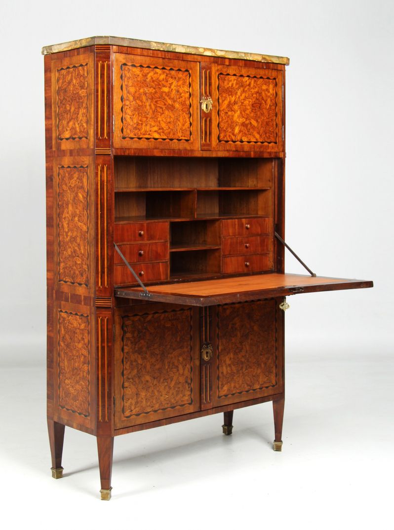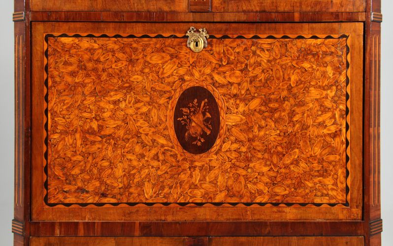 La technique de placage avec de très petites branches que l'on peut voir sur le secrétaire proposé ici n'est apparue qu'une bonne centaine d'années plus tard et est associée au maître Jean François Hache (1730-1796), établi à Grenoble en France. Hache, dont les meubles étaient principalement fabriqués à partir de bois locaux tels que le noyer, l'érable sycomore, le peuplier, le tilleul, le wisteria et le bois fruitier, mettait l'accent sur l'aspect décoratif des placages et de la marqueterie. Ses fines marqueteries, telles que des vases, des urnes, des guirlandes de fleurs et des médaillons représentant des instruments de musique ou de jardinage, se détachent sur des fonds en bois de veinage ou de racine.