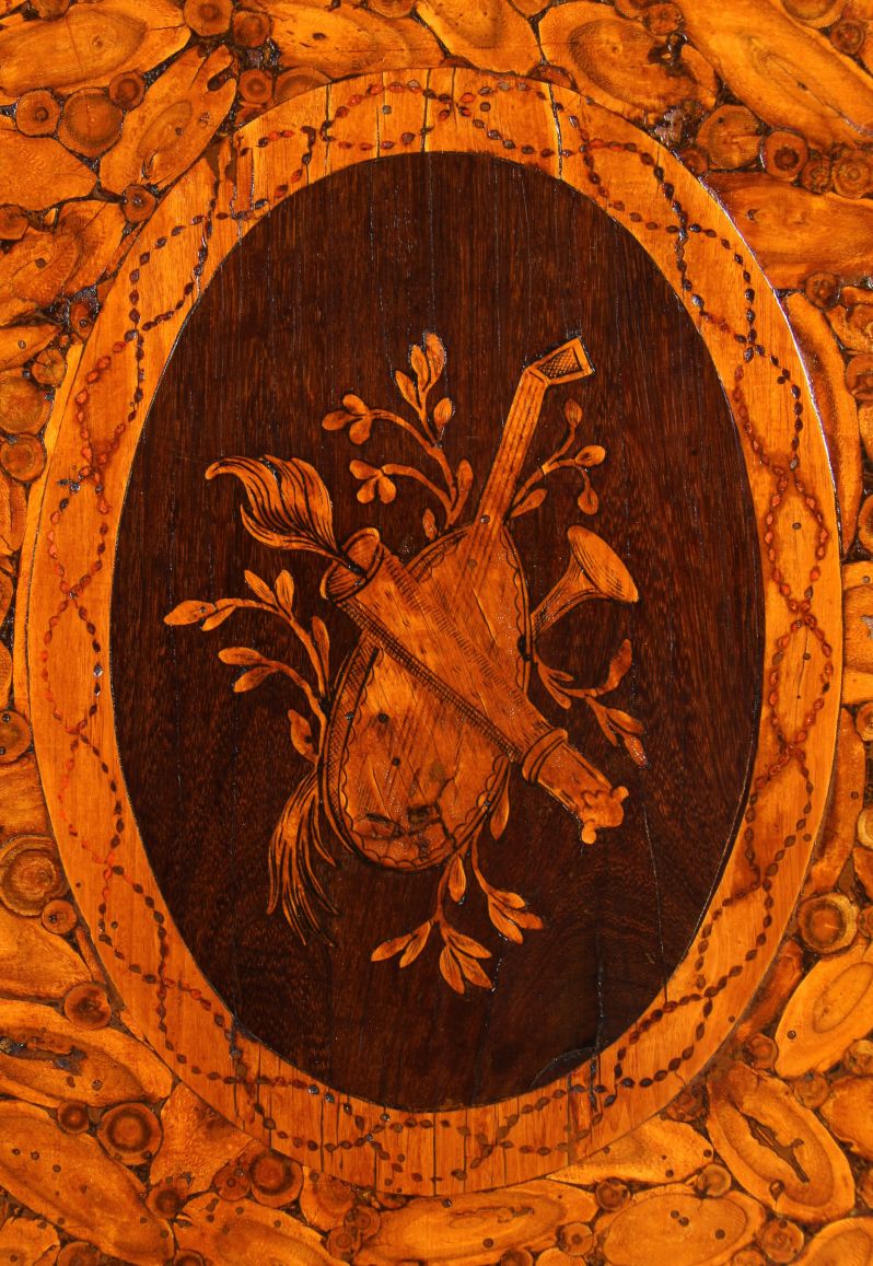 L'abattant du secrétaire présente un gracieux médaillon ovale encadré d'une bordure à pois. Dans une marqueterie claire et finement gravée, nous voyons des flambeaux et des instruments de musique.