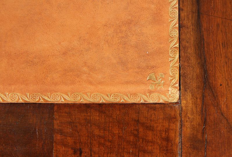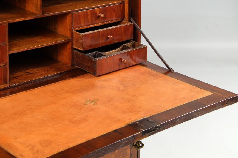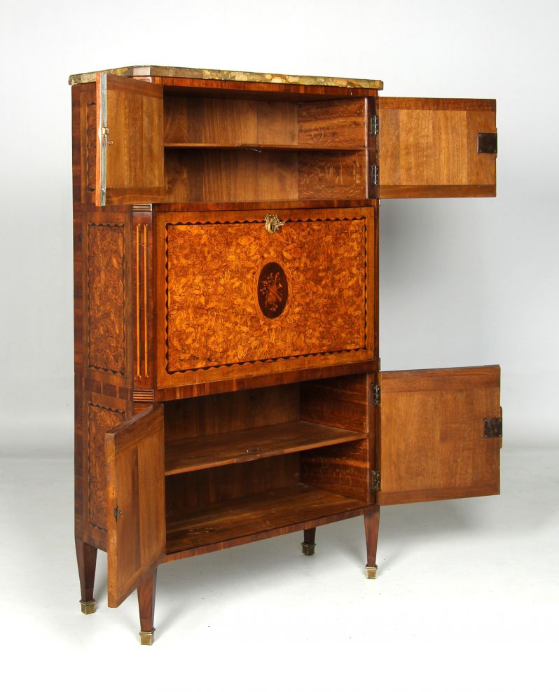 Lorsque l'on ouvre le volet d'écriture, on découvre une surface d'écriture recouverte de cuir et décorée d'or. Au-dessus se trouvent deux étagères, flanquées de chaque côté de trois tiroirs. L'un des tiroirs est pourvu de la division habituelle pour le rangement des pots d'encre et de sable de dispersion. Trois compartiments ouverts constituent la partie supérieure du meuble.