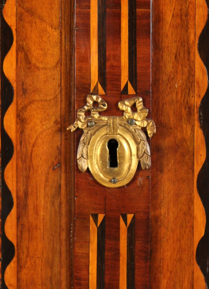 Entre chaque paire de portes se trouve un pilastre central qui, à l'instar des pilastres du meuble, est incrusté d'une marqueterie rectiligne. Les bois contrastant entre le clair et le foncé créent une sorte d'effet d'ombre, de sorte que les incrustations rappellent les cannelures, un élément de décoration fréquemment utilisé à l'époque.