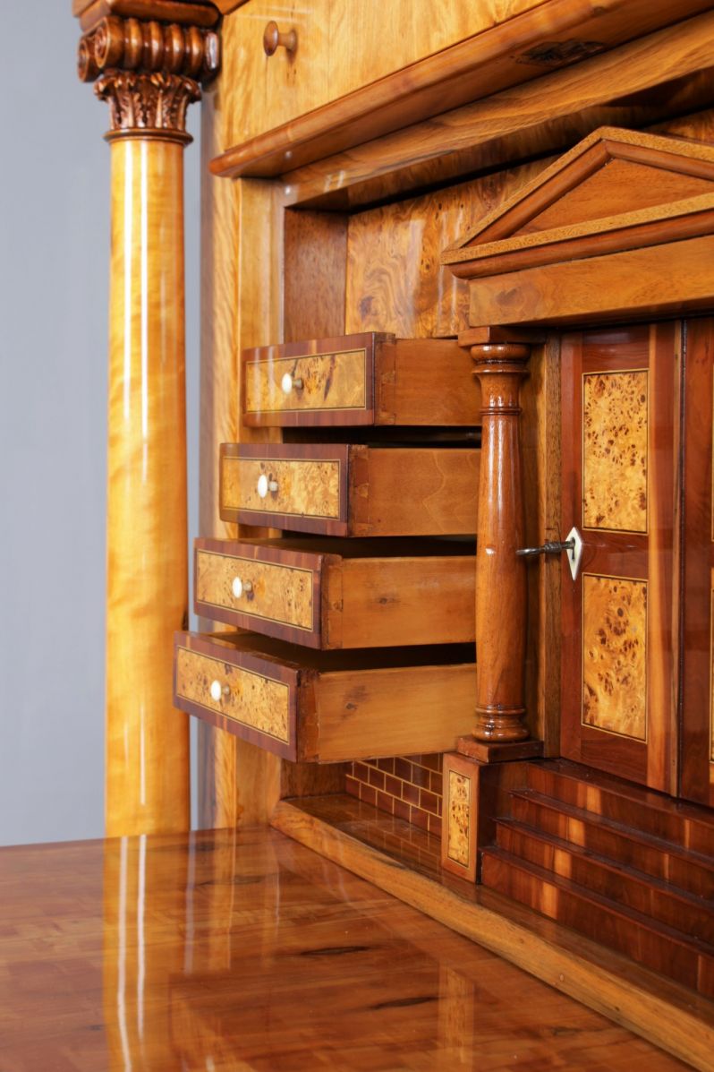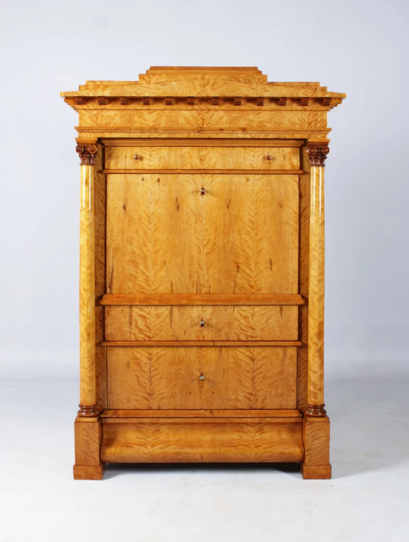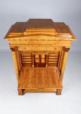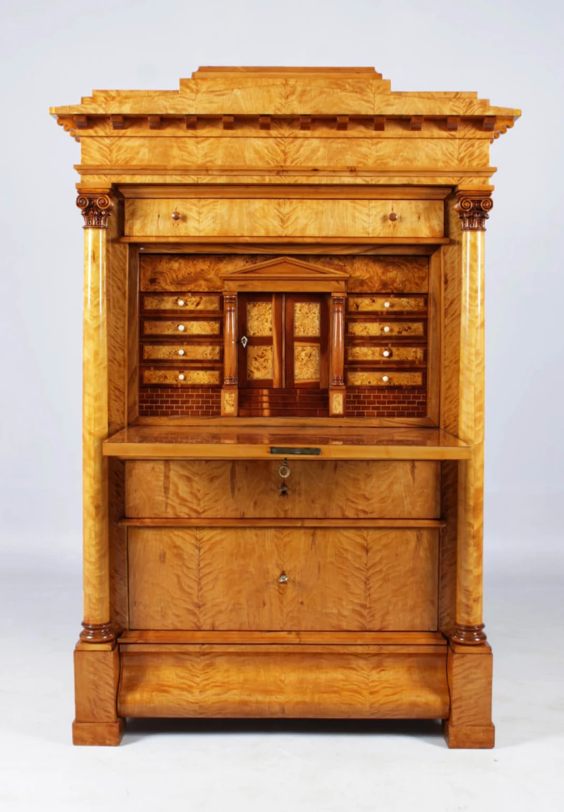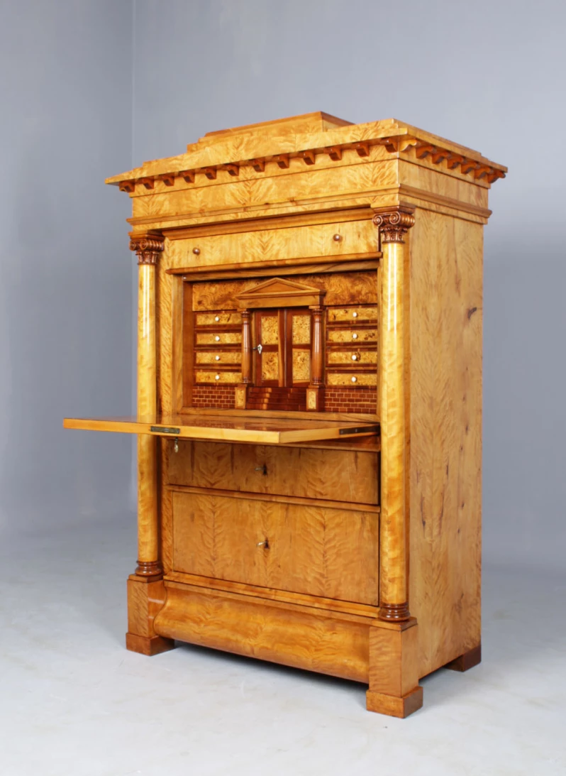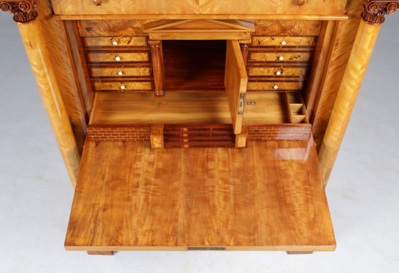 Magnifique secrétaire avec des colonnes massives et un intérieur de rêve. Le bois clair du bouleau à l'extérieur est discrètement contrasté par le prunier et le bouleau à l'intérieur. Les ferrures en forme de trou de serrure et les chapiteaux ioniques artistiquement conçus s'intègrent parfaitement à l'ensemble par leur couleur.