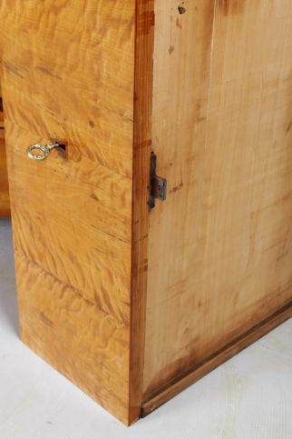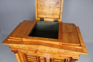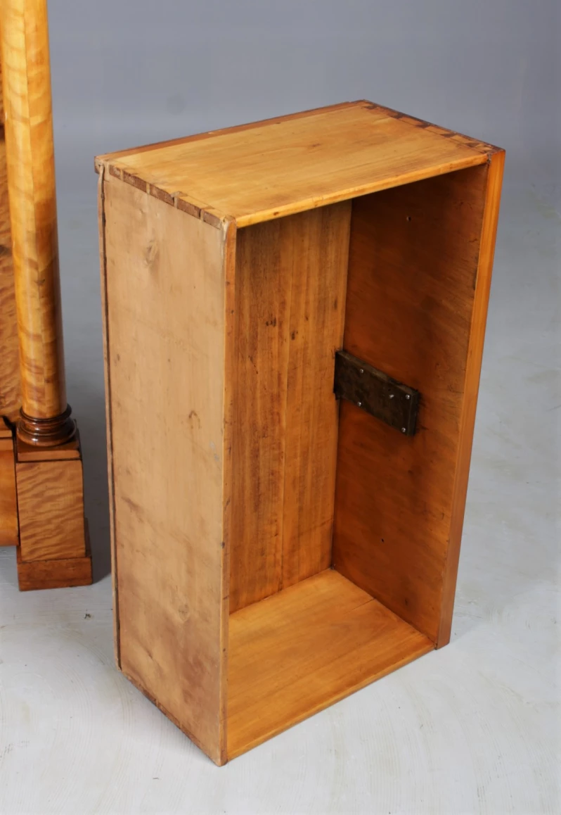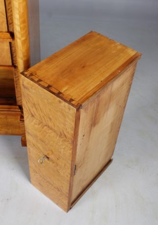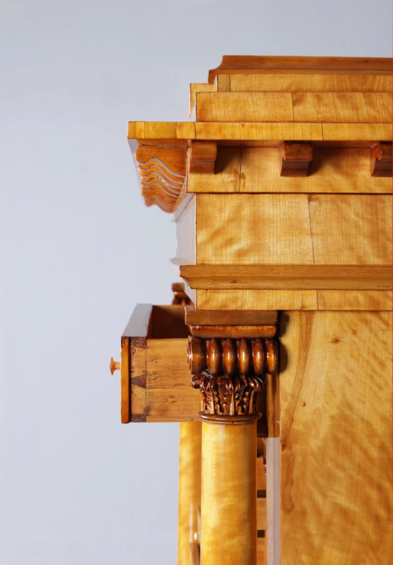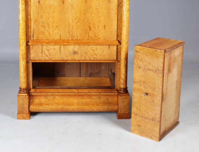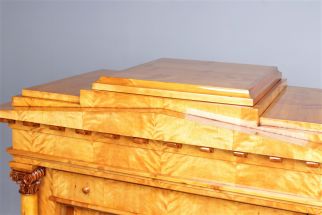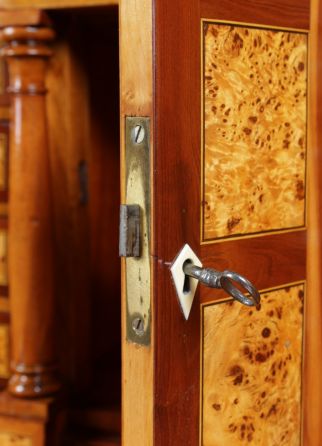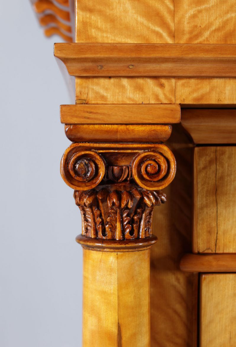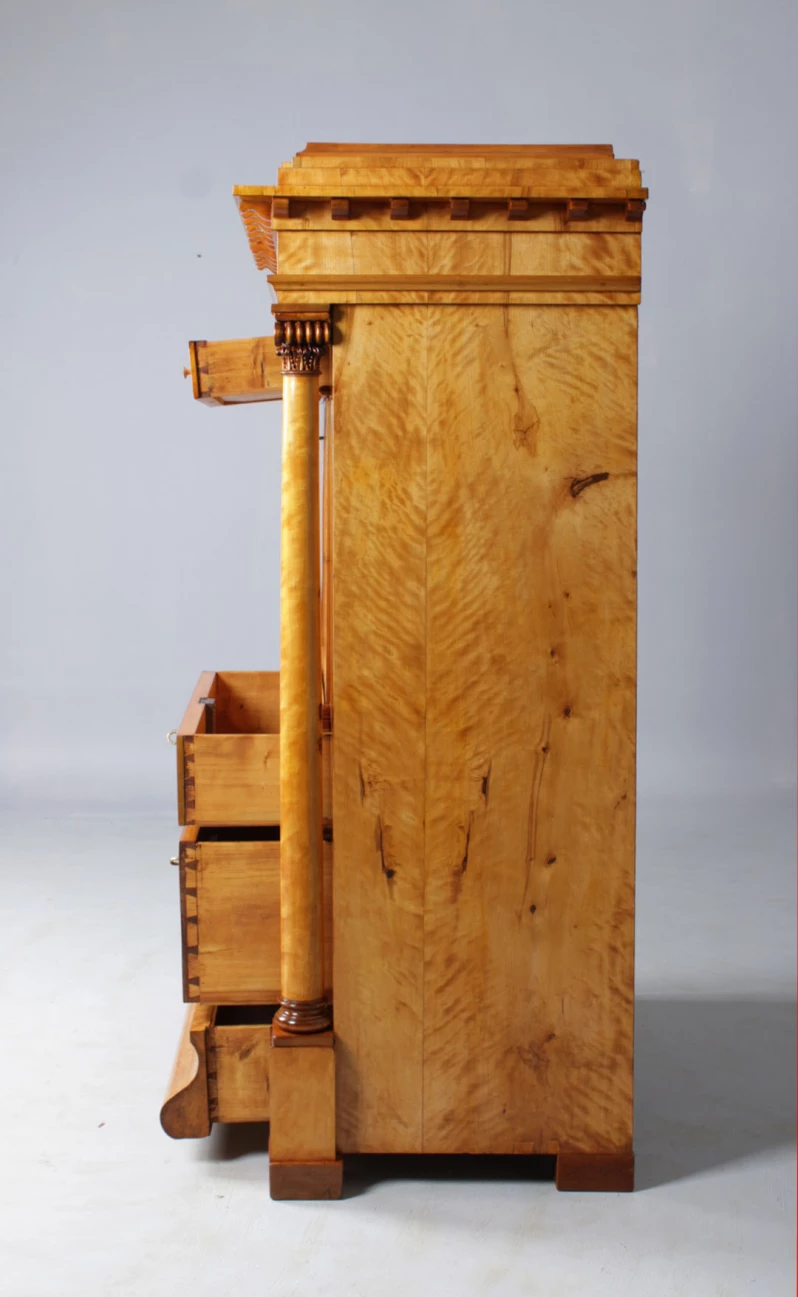 Magnifique secrétaire avec des colonnes massives et un intérieur de rêve. Le bois clair du bouleau à l'extérieur est discrètement contrasté par le prunier et le bouleau à l'intérieur. Les ferrures en forme de trou de serrure et les chapiteaux ioniques artistiquement conçus s'intègrent parfaitement à l'ensemble par leur couleur.