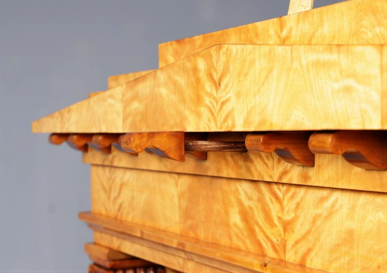 La structure du meuble se compose de trois tiroirs en bas, de la porte d'écriture située au-dessus et d'un autre large tiroir en haut. Le haut du meuble est constitué d'une crémaillère avec un toit en écaille. La fermeture en escalier qui se trouve au-dessus cache un autre grand compartiment qui ne s'ouvre que par un mécanisme secret.