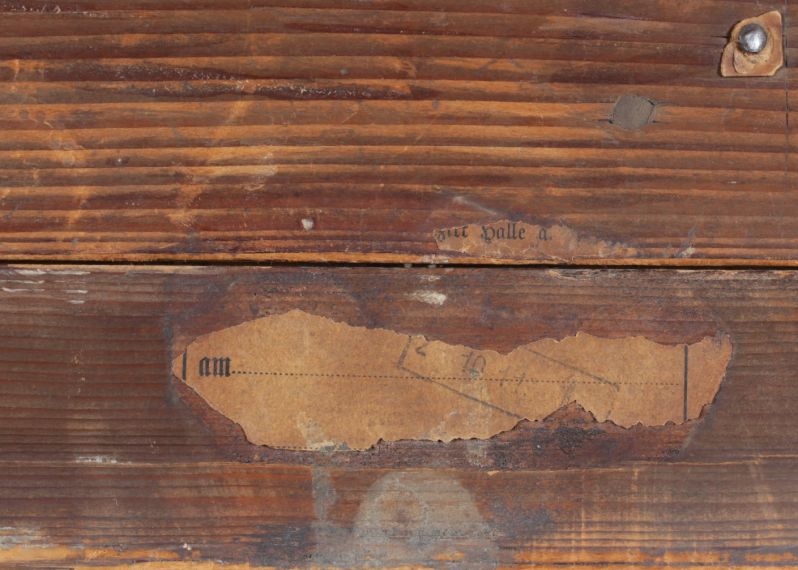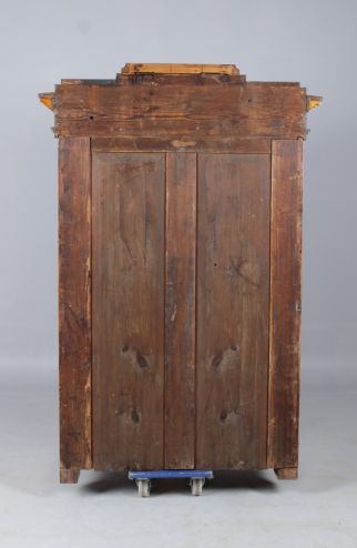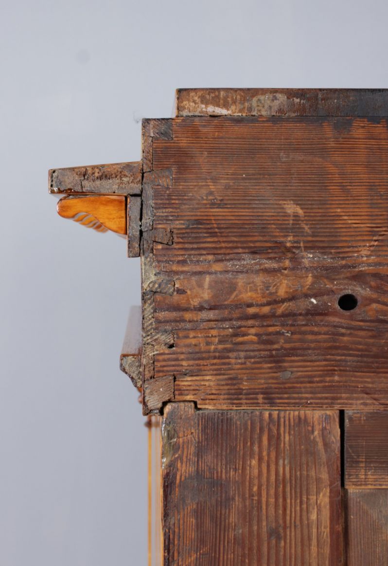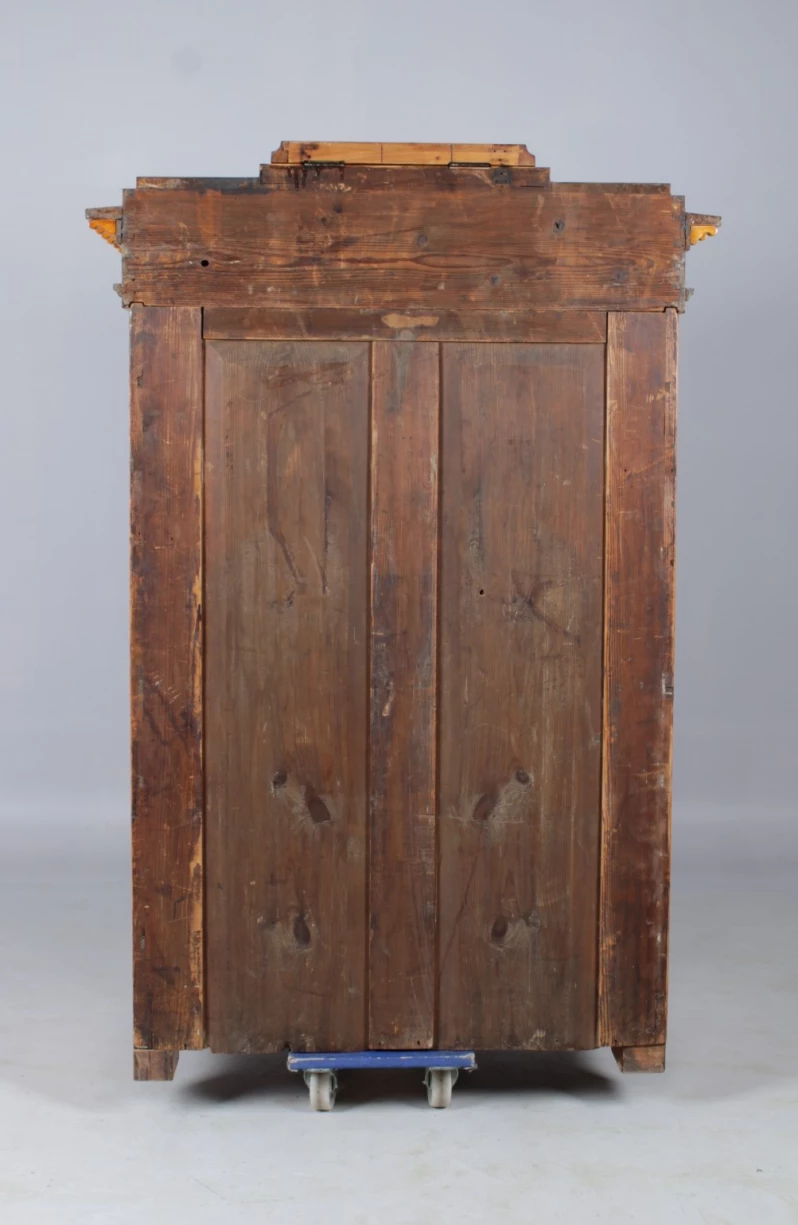 L'intérieur strictement inspiré de l'architecture dominante, le tiroir inférieur bombé et les colonnes pleines massives reposant sur des pieds sabots sont typiques de la région. Des fragments d'une étiquette d'expédition de la Reichsbahn fixée sur le panneau arrière et portant l'inscription Halle a. (der Saale ?) renforcent cette tendance.
