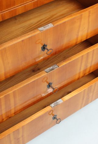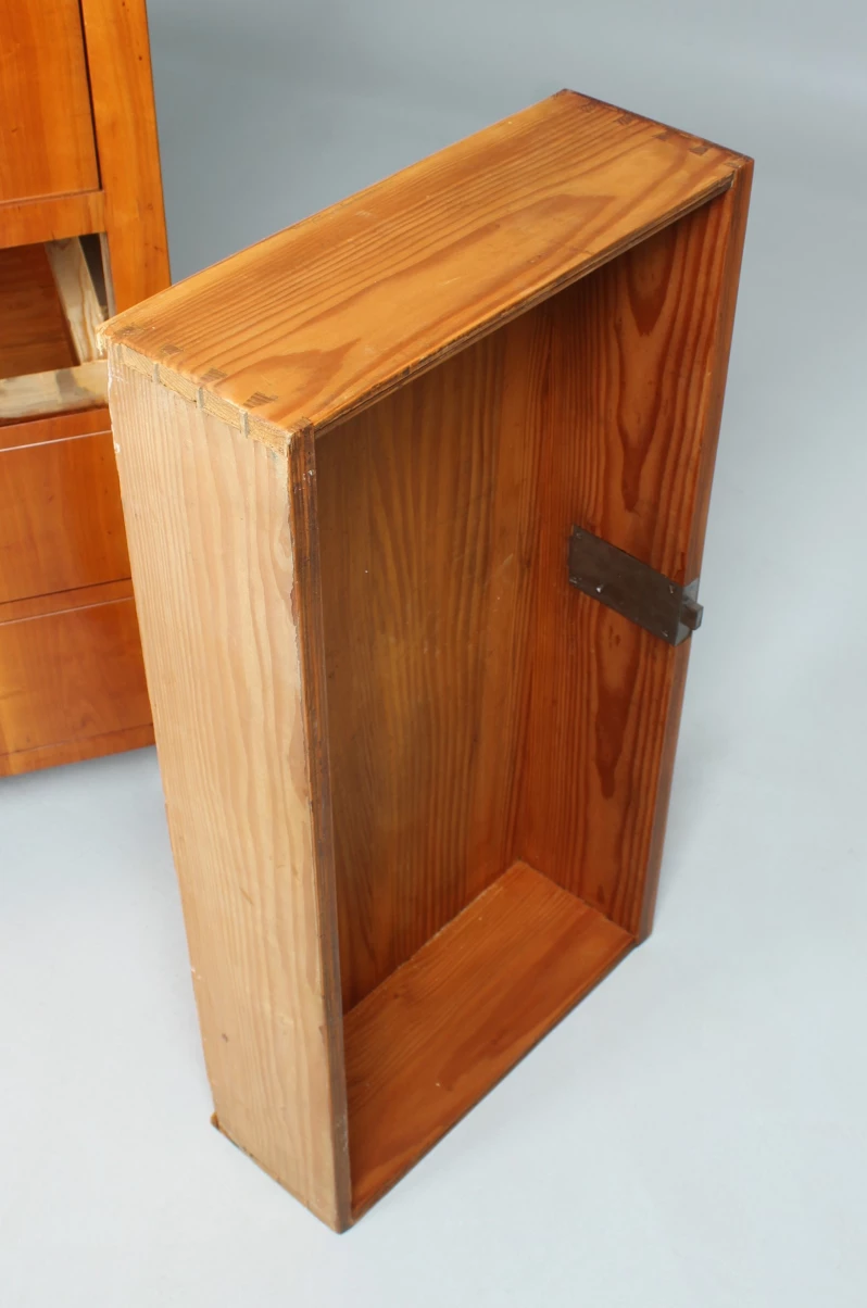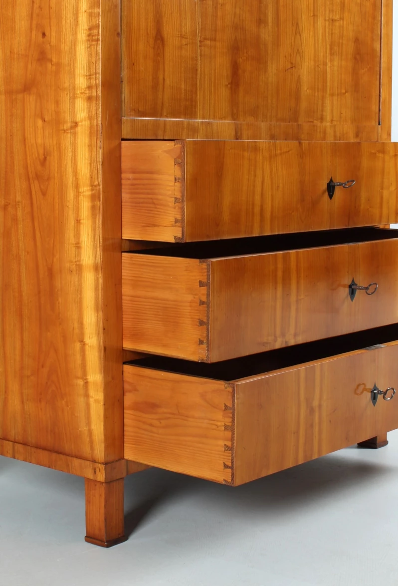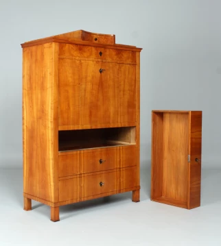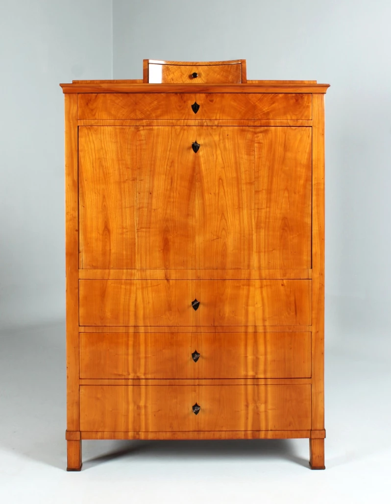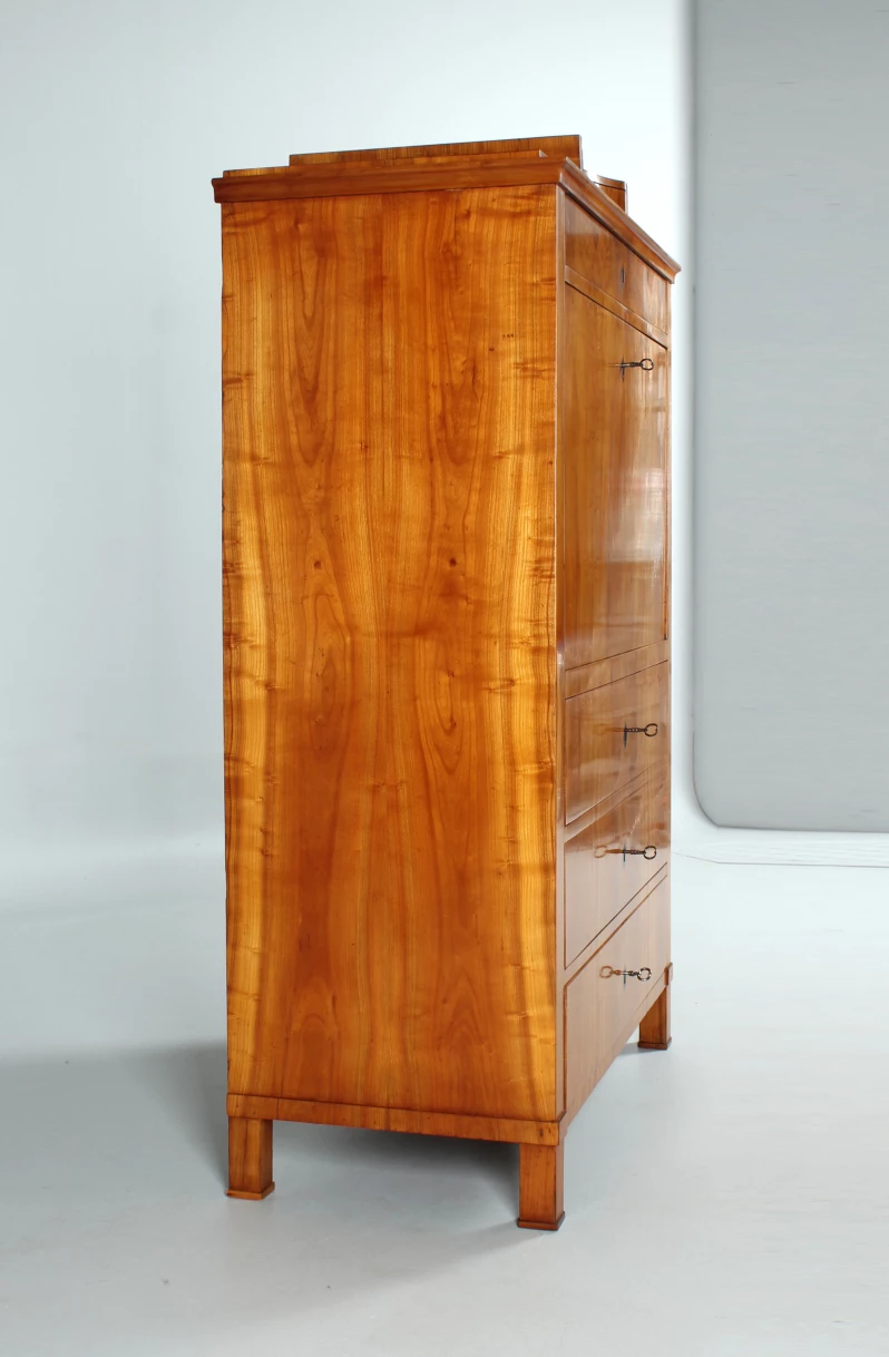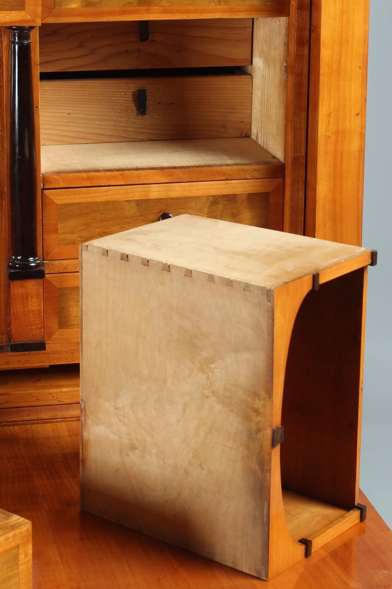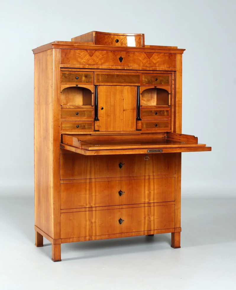Le type de meuble "secrétaire" tel que vous le voyez ici jouissait d'une grande popularité dans la période Biedermeier. Encore à l'époque baroque et classique, on construisait principalement des secrétaires à roulettes et à volets inclinés. La forme classique du secrétaire sur pied, également appelé armoire à écrire, n'est apparue qu'à la fin du 18e siècle.