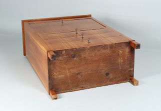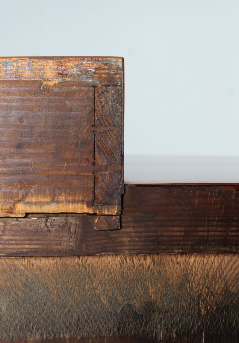 La finition de ce meuble est tout à fait remarquable. La photo montrant le compartiment ouvert montre bien la finition soignée du zingage en queue d'aronde. La photo détaillée du panneau arrière montre comment les différents éléments sont reliés entre eux au moyen de baguettes d'arête.