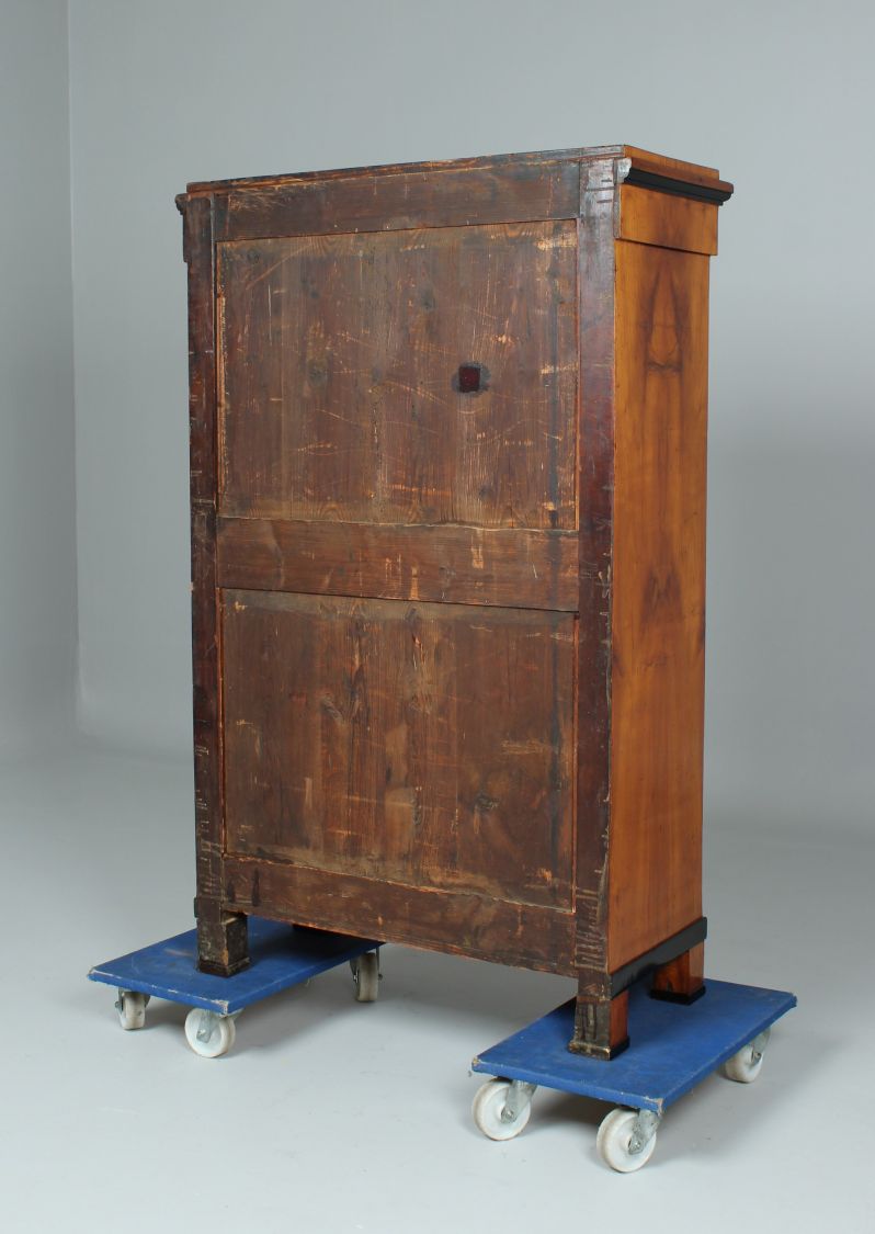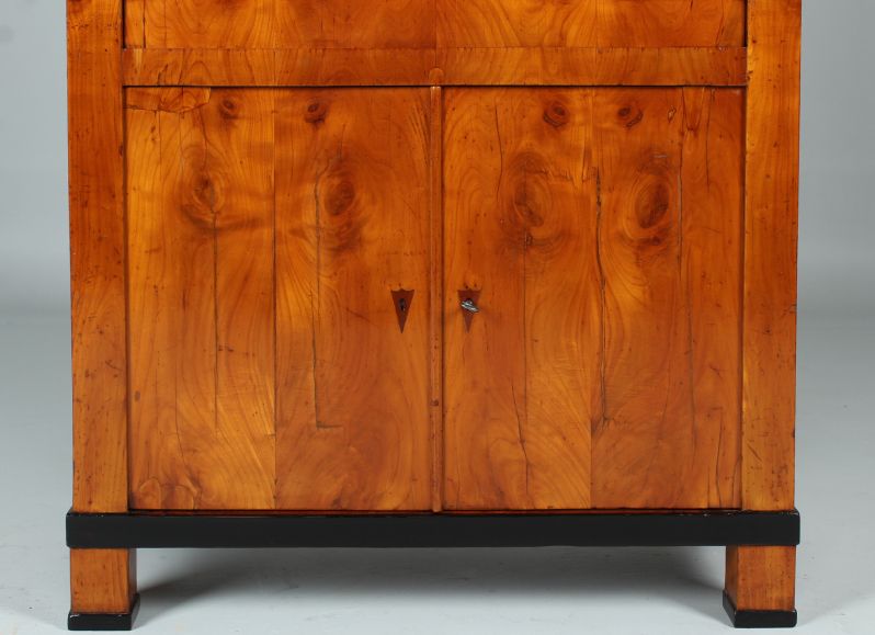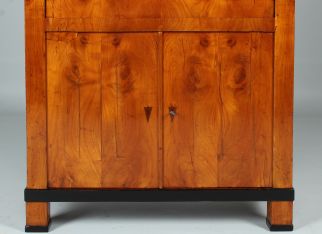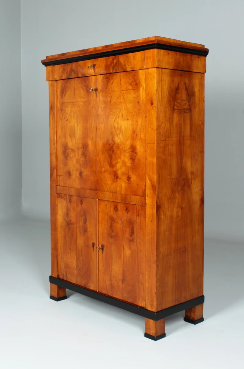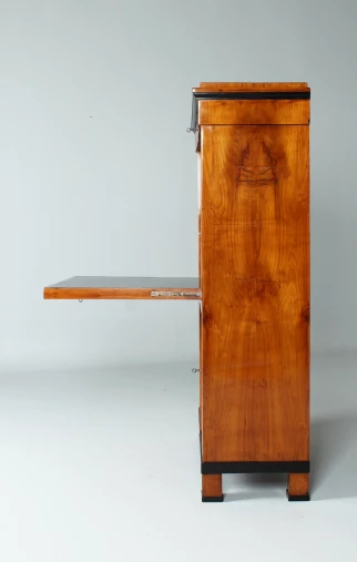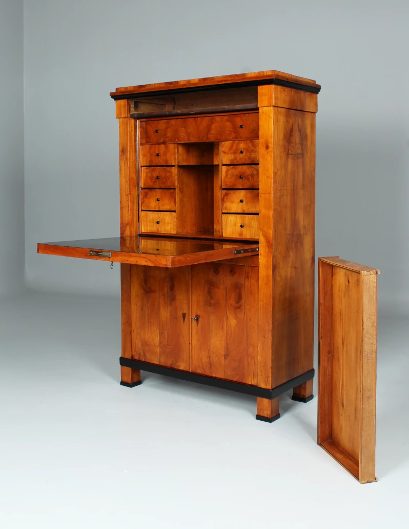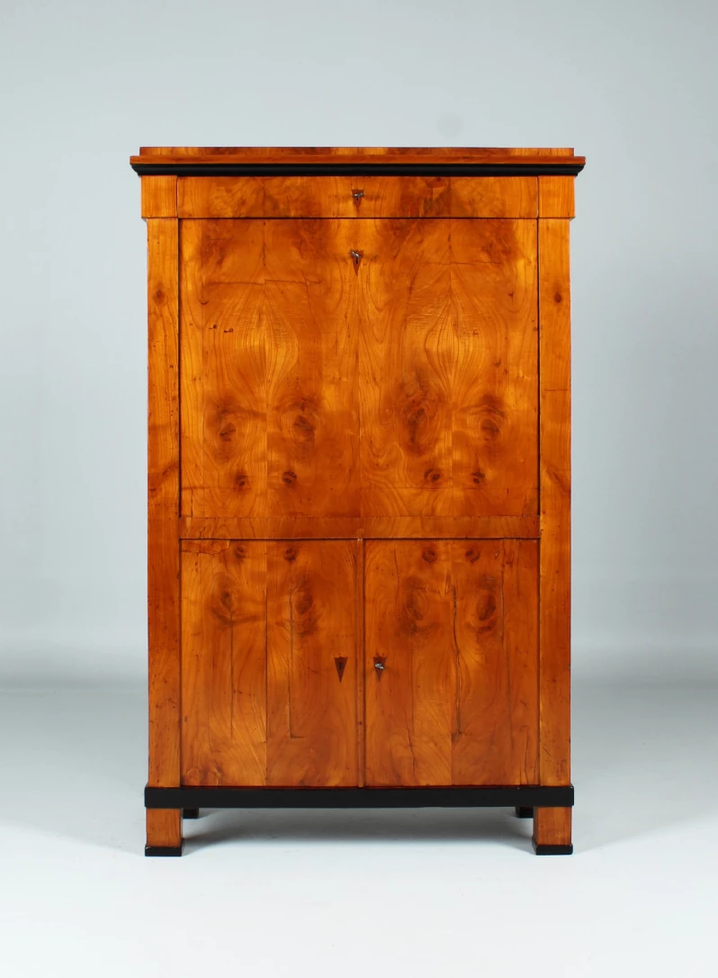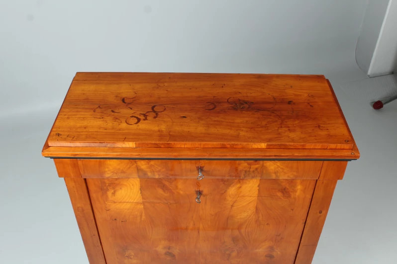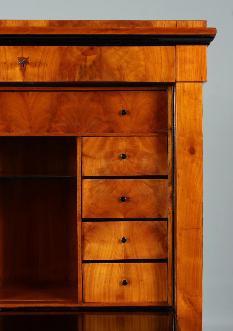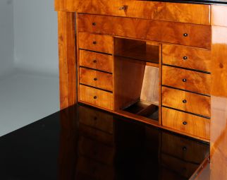 Le type de meuble "secrétaire", tel que vous le voyez ici, jouissait d'une grande popularité dans la période Biedermeier. Dans le baroque et le classicisme, on construisait encore principalement des secrétaires à roulettes et à volets inclinés. La forme classique du secrétaire sur pied, également appelé écritoire, n'est apparue qu'à la fin du 18e siècle.