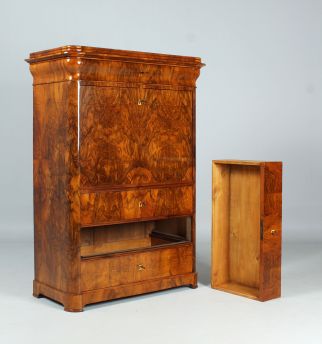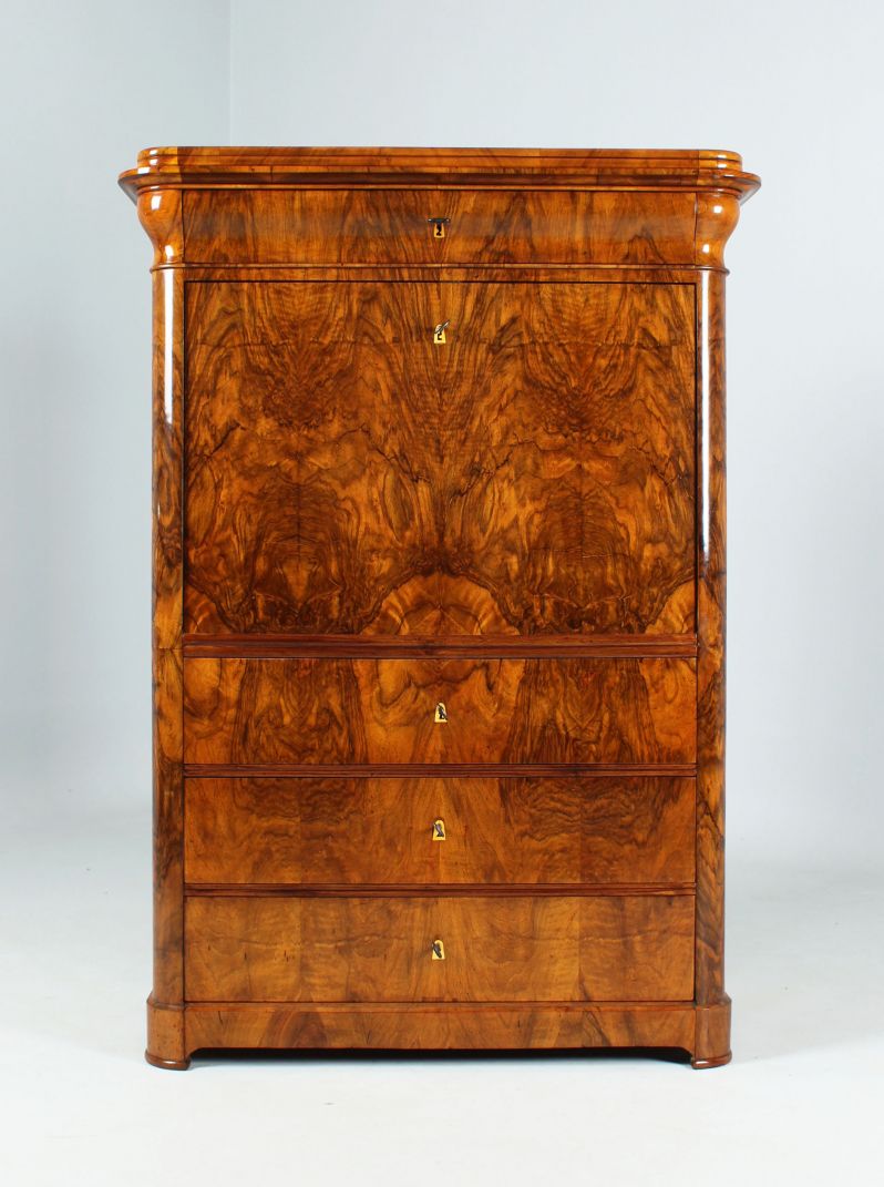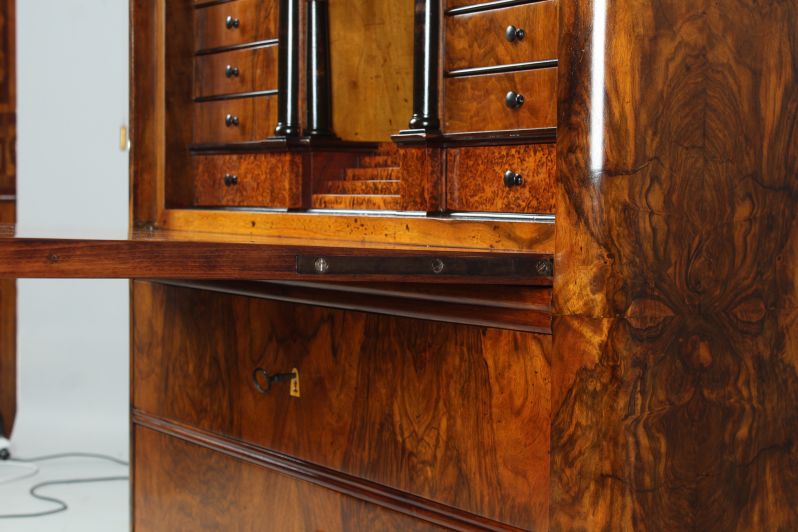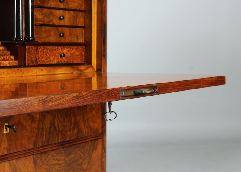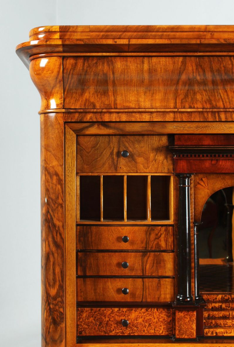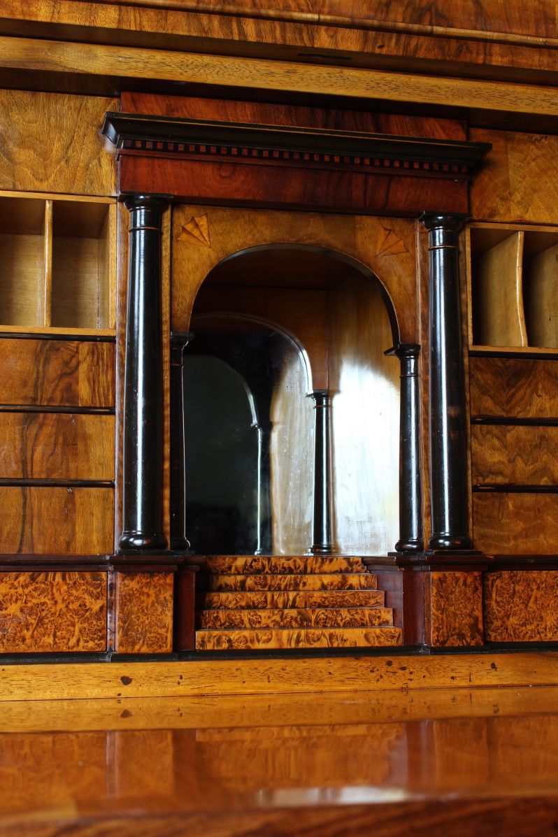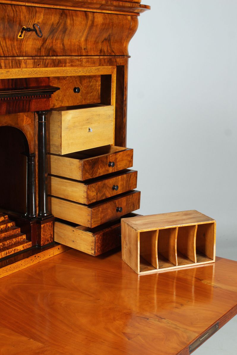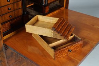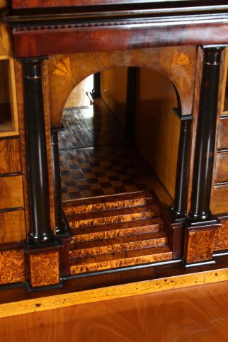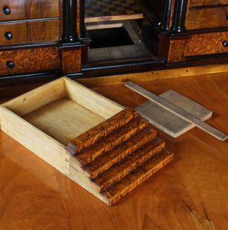 Derrière le plateau d'écriture rabattable se cache un intérieur spectaculaire avec un compartiment central, miroité au dos et parqueté sur le fond. Le compartiment se termine en haut par un arc en plein cintre et possède en bas un tiroir conçu comme une montée d'escalier. Sous l'escalier se trouve un compartiment secret.