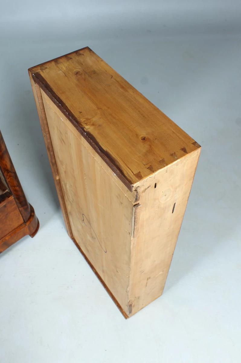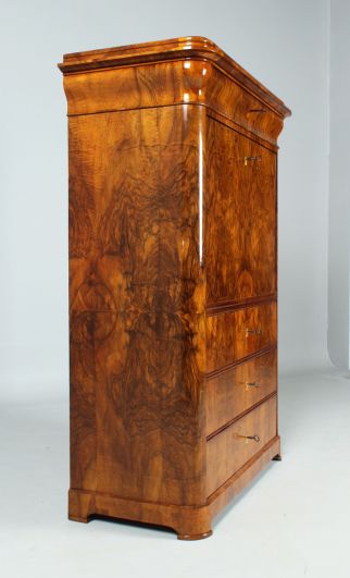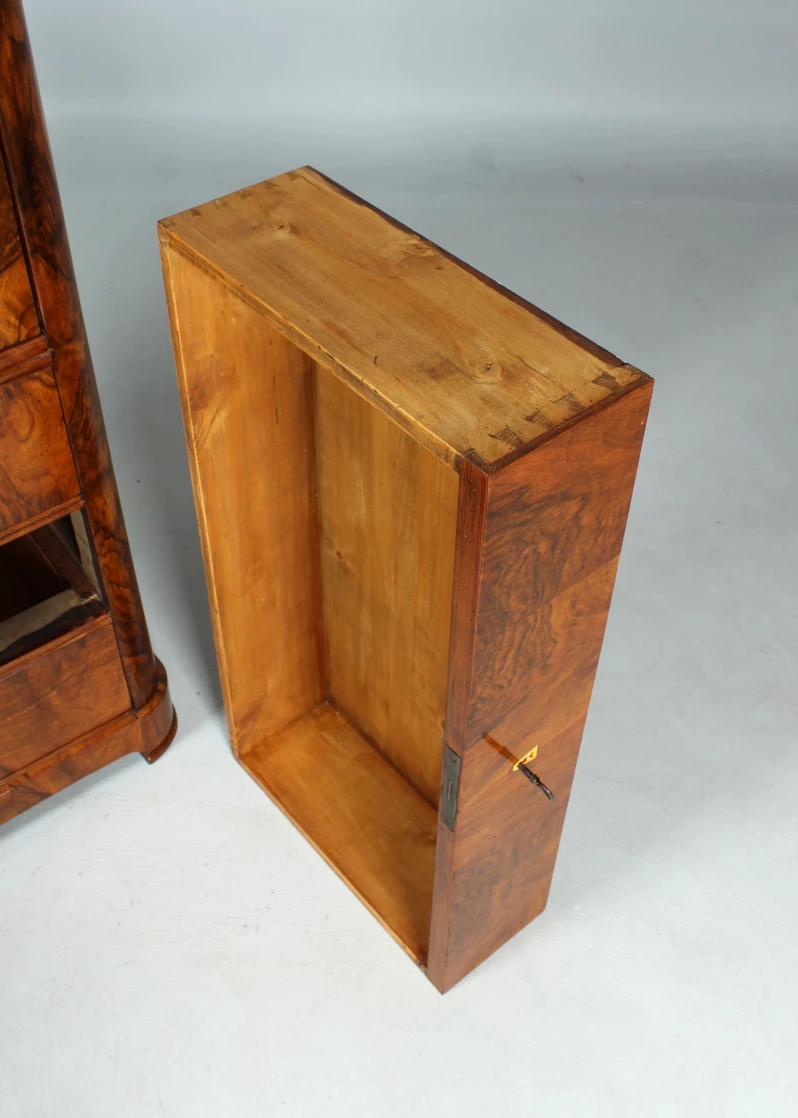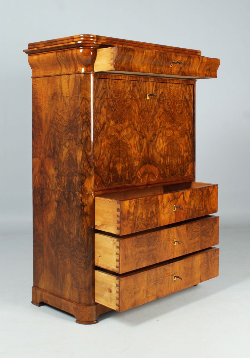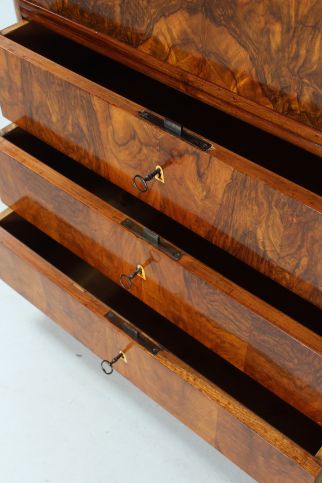 Les trois tiroirs du bas sont plaqués en fibre de bouleau. Au-dessus suivent à l'extérieur trois tiroirs superposés en noyer ainsi que des compartiments à lettres avec des tiroirs cachés derrière.